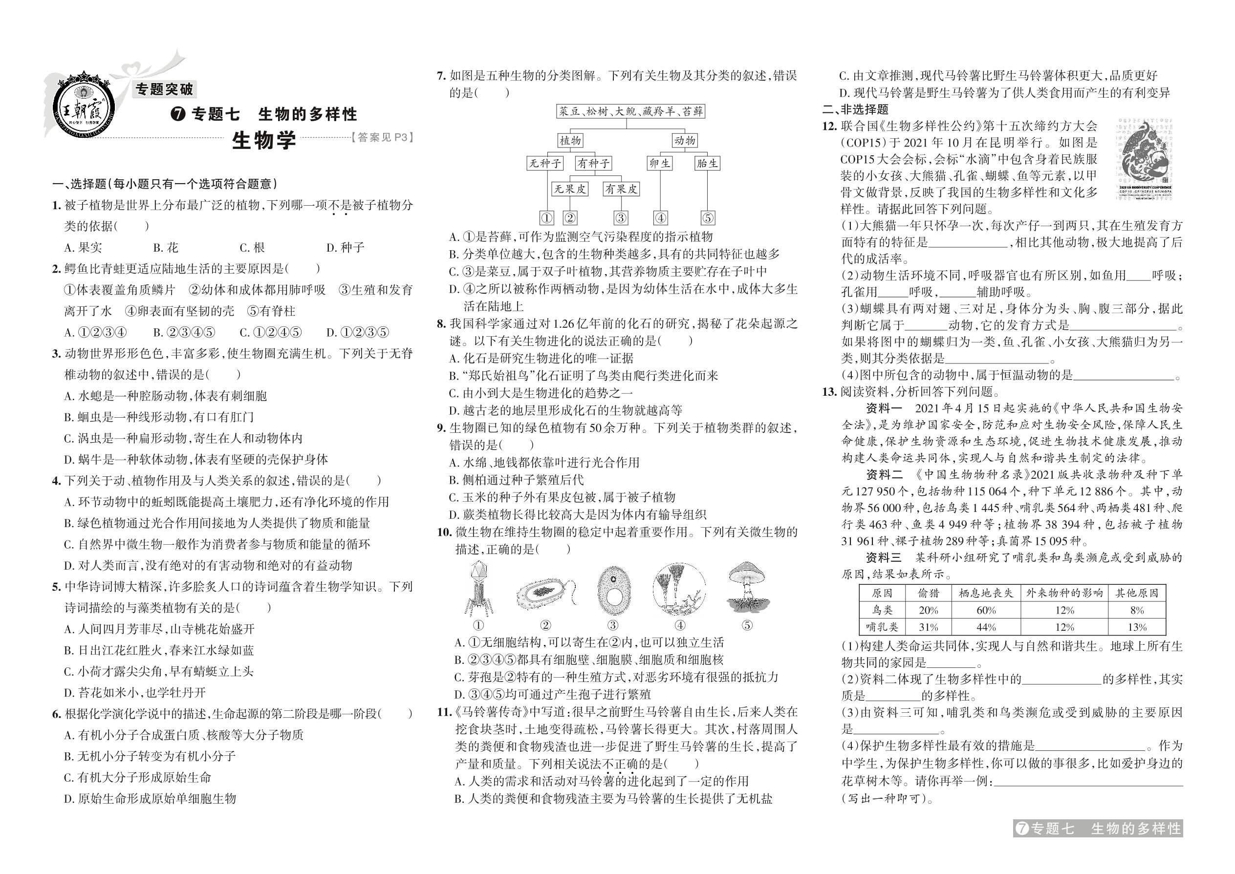 中考生物专题突破——专题七 生物的多样性【7】