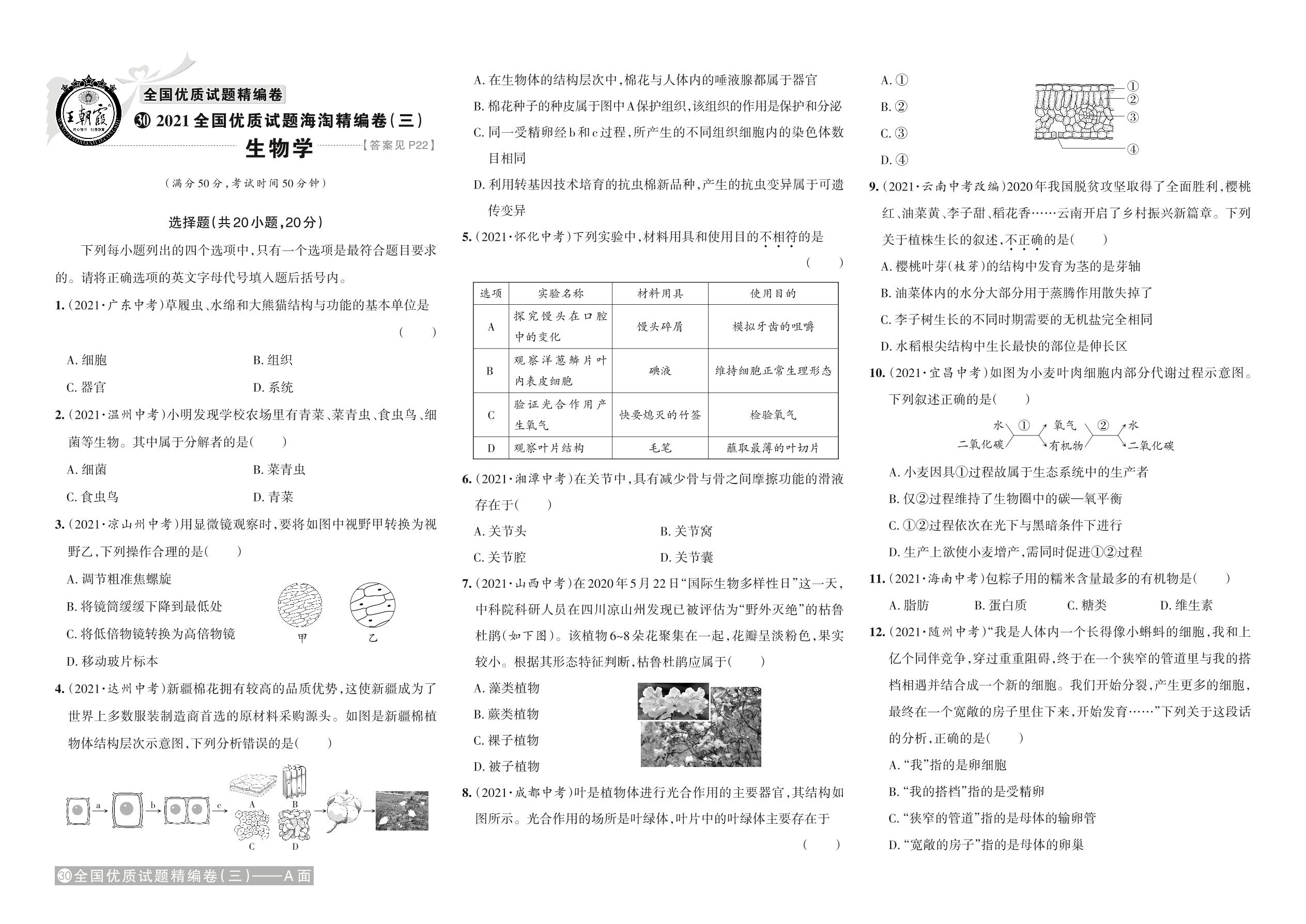 2021全国优质试题海淘精编卷(三)·中考生物【30】