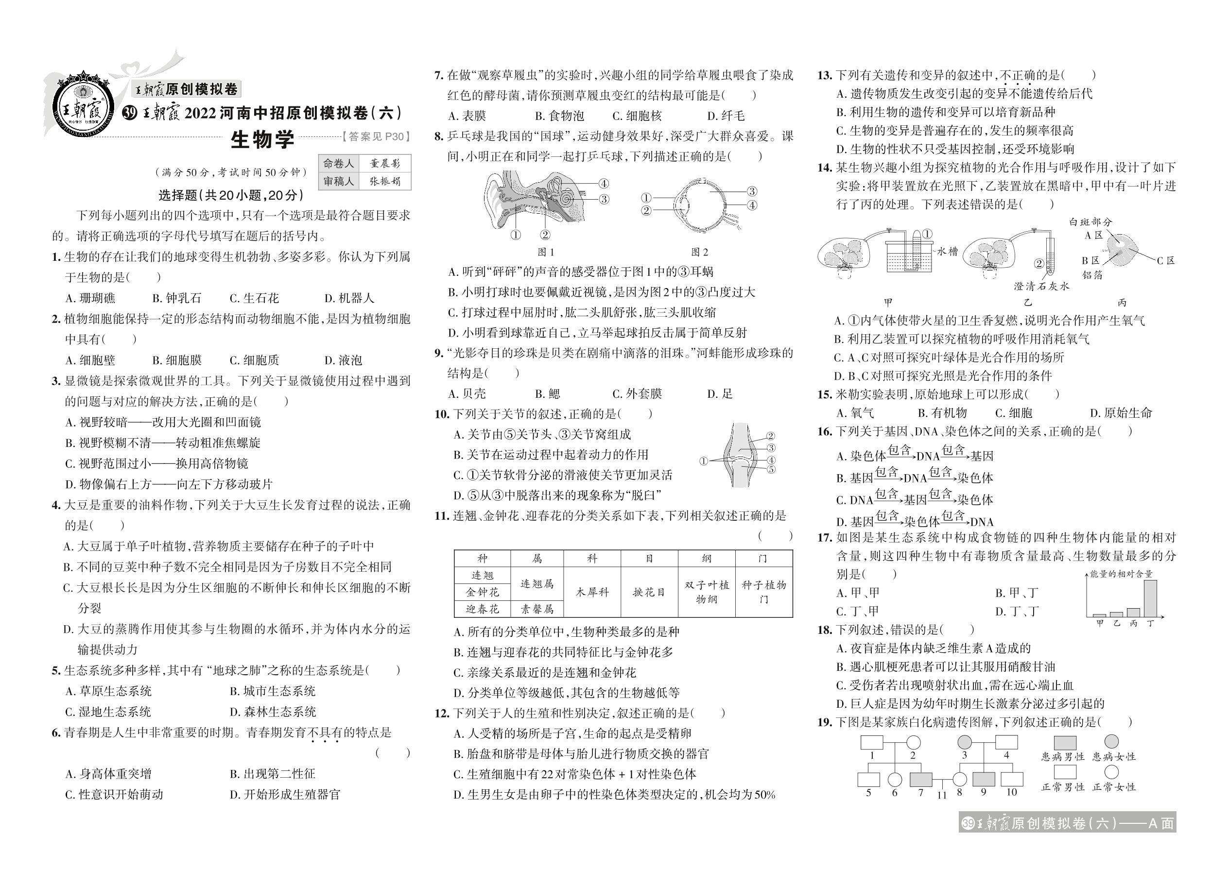 王朝霞2022河南中招原创模拟卷(六)·生物【39】