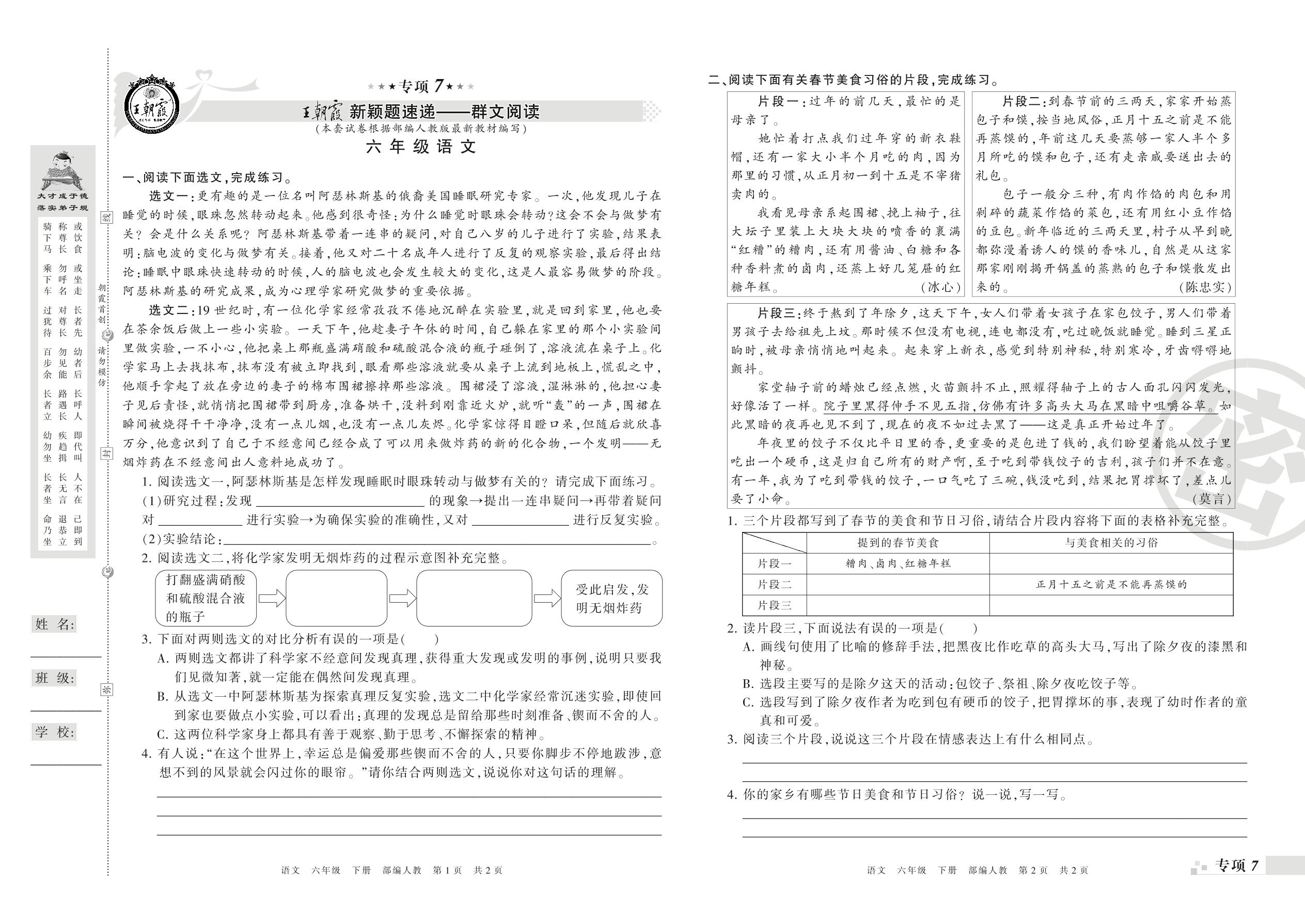 王朝霞期末专项卷——新颖题速递:群文阅读、古诗文阅读六年级下册语文(人教版)_R21080224311【0】