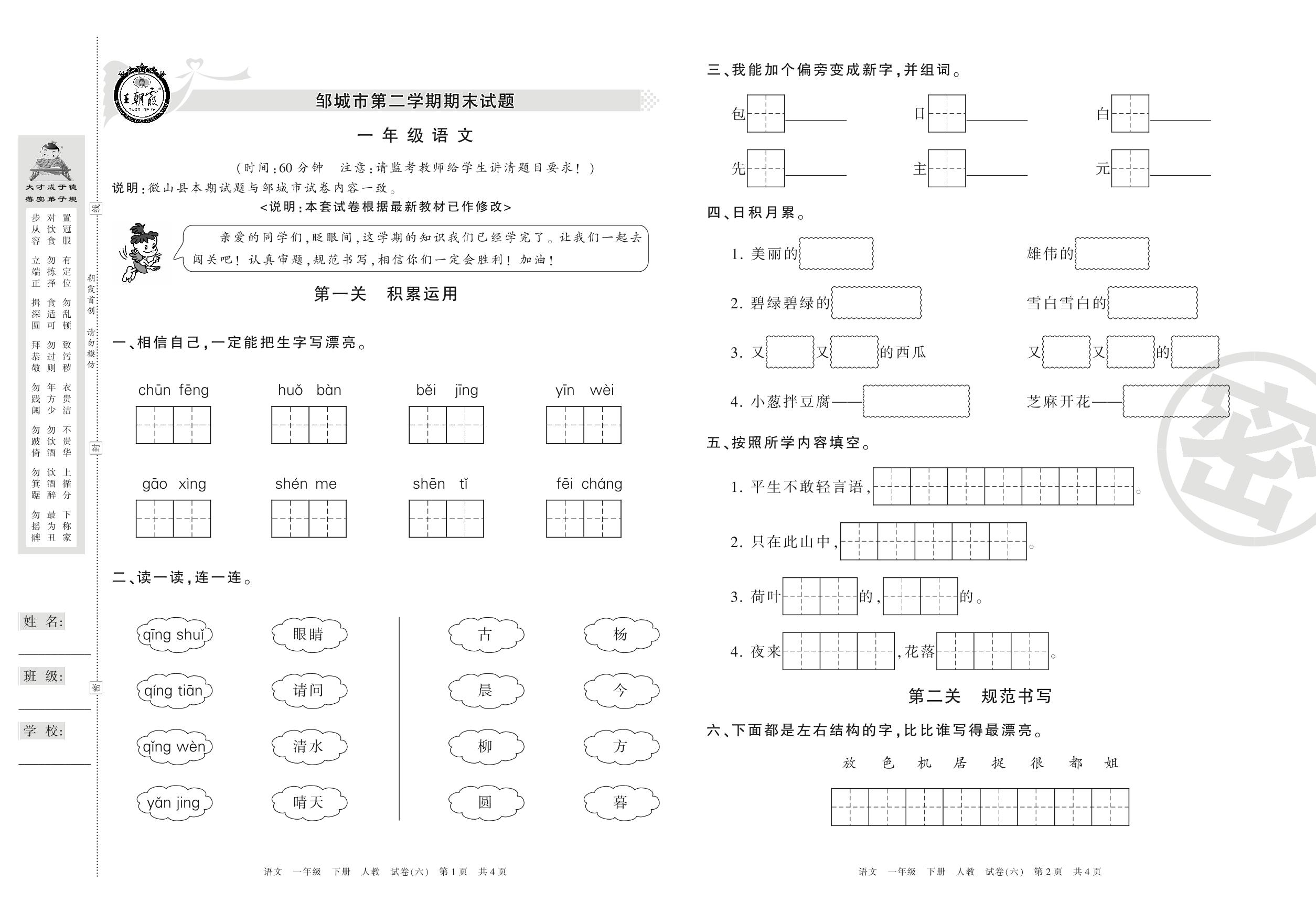 2015-2016学年第二学期邹城市一年级语文试卷(人教版)【6】