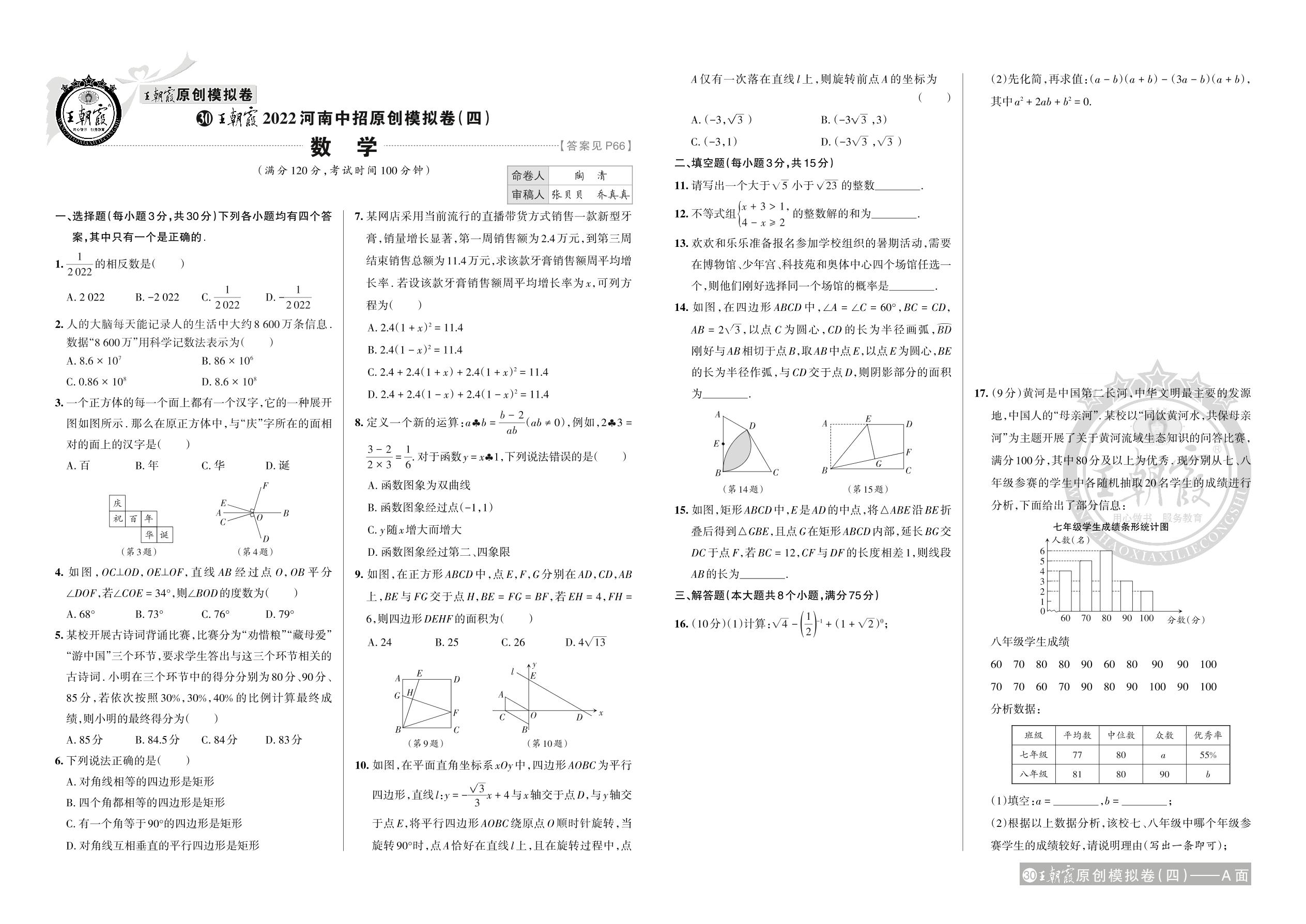 王朝霞2022河南中招原创模拟卷(四)·数学【30】
