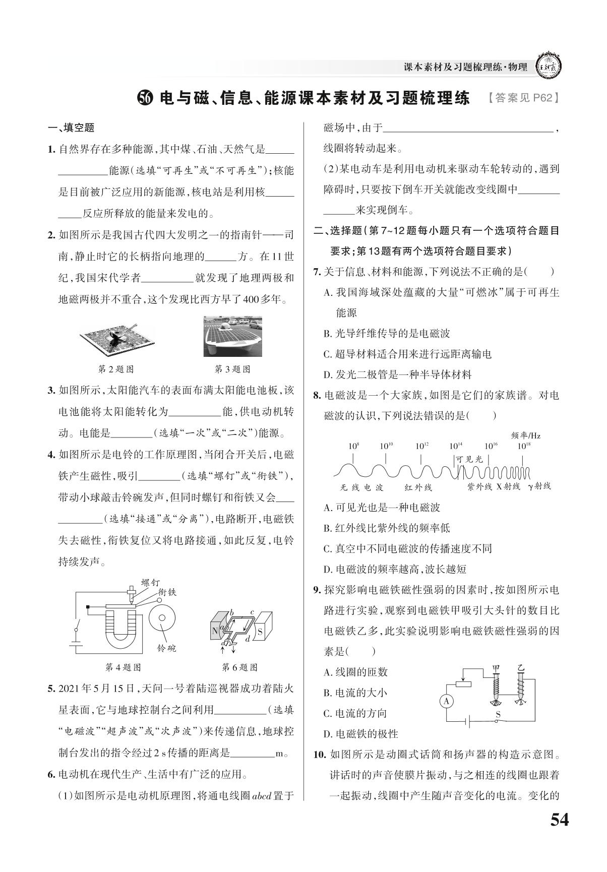 中考物理课本素材及习题梳理练——电与磁、信息、能源课本素材及习题梳理练【56】