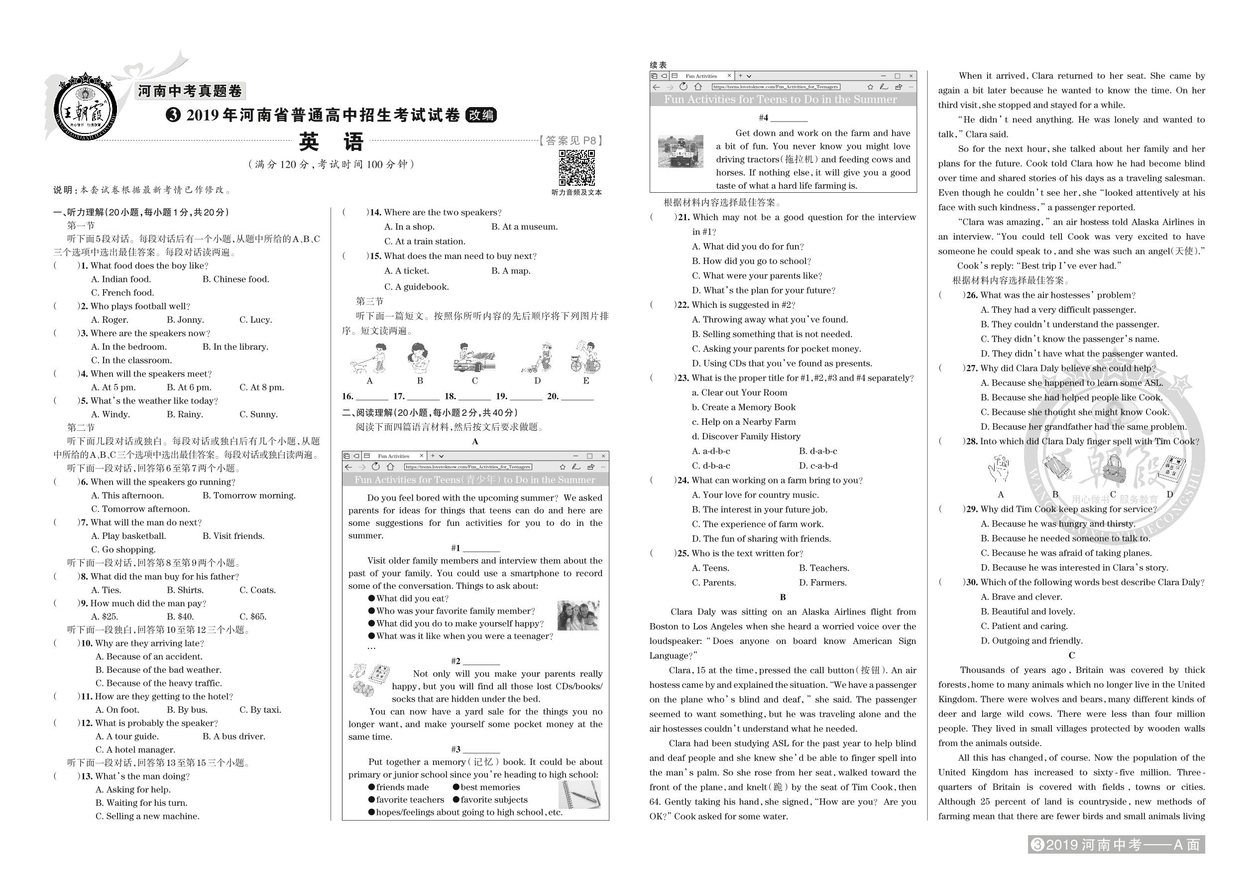 2019年河南省普通高中招生考试试卷(改编)·英语【3】