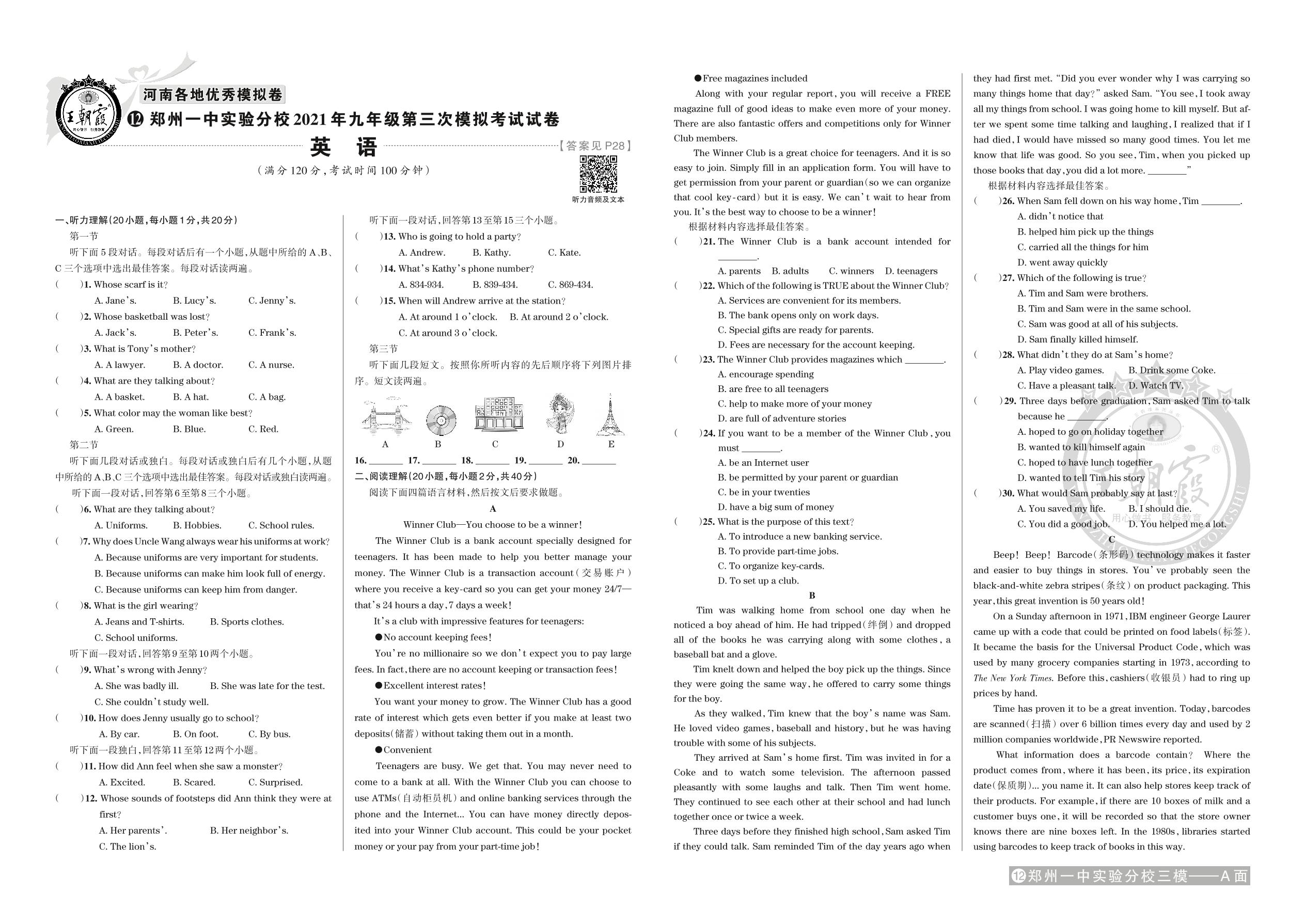 郑州一中实验分校2021年九年级第三次模拟考试试卷·英语【12】