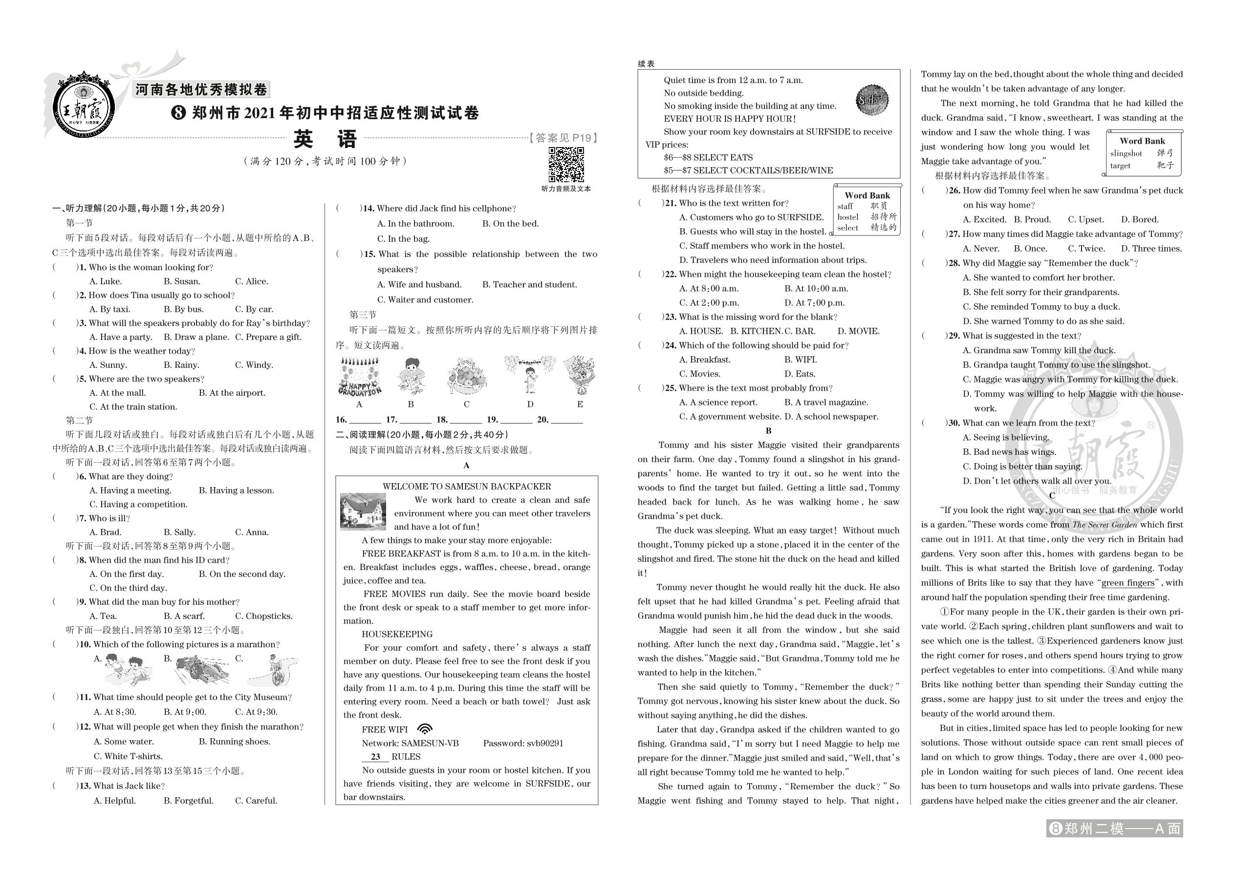 郑州市2021年初中中招适应性测试试卷·英语【8】