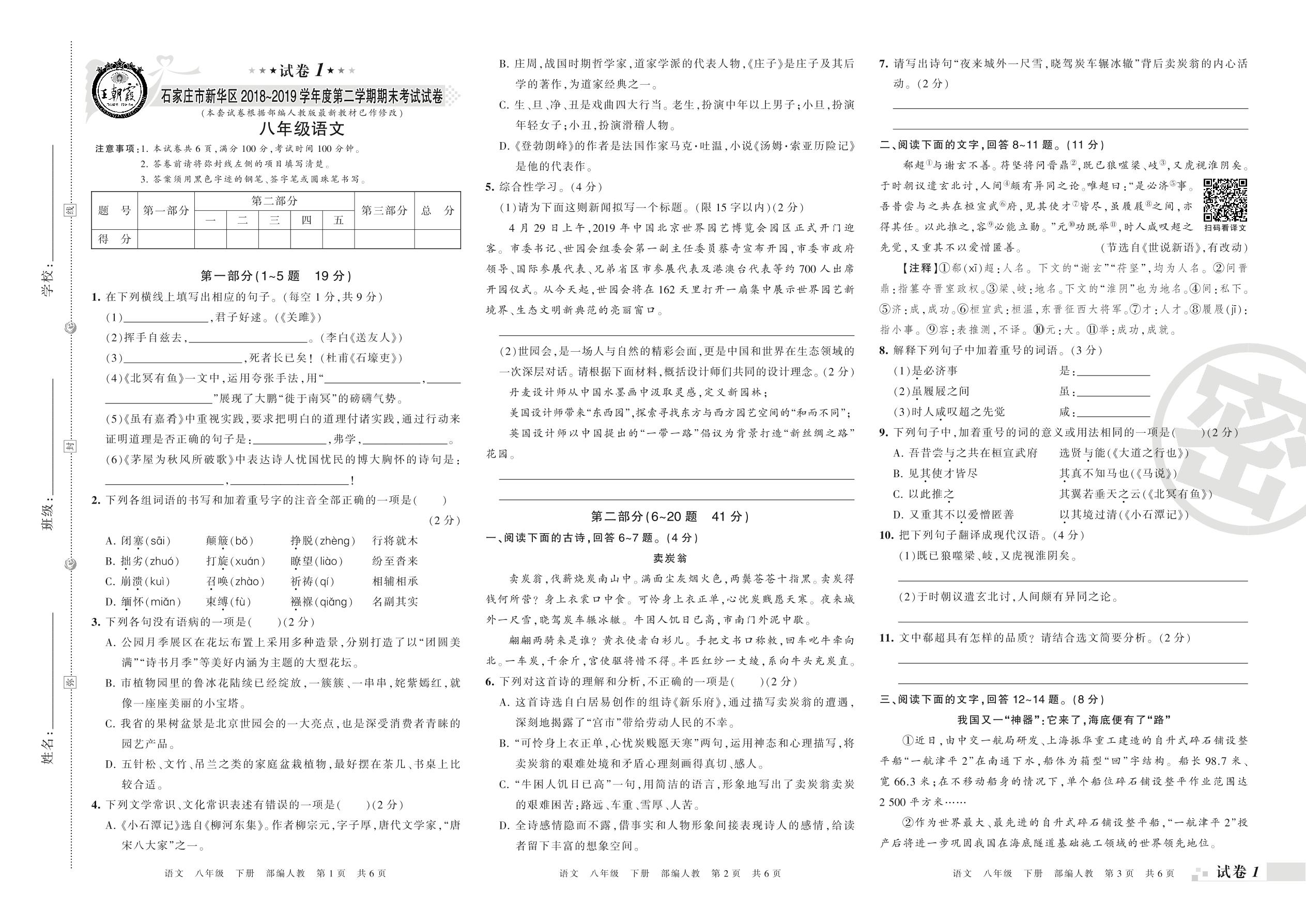 2018-2019学年第二学期石家庄市石家庄新华区八年级语文试卷(人教版)【1】