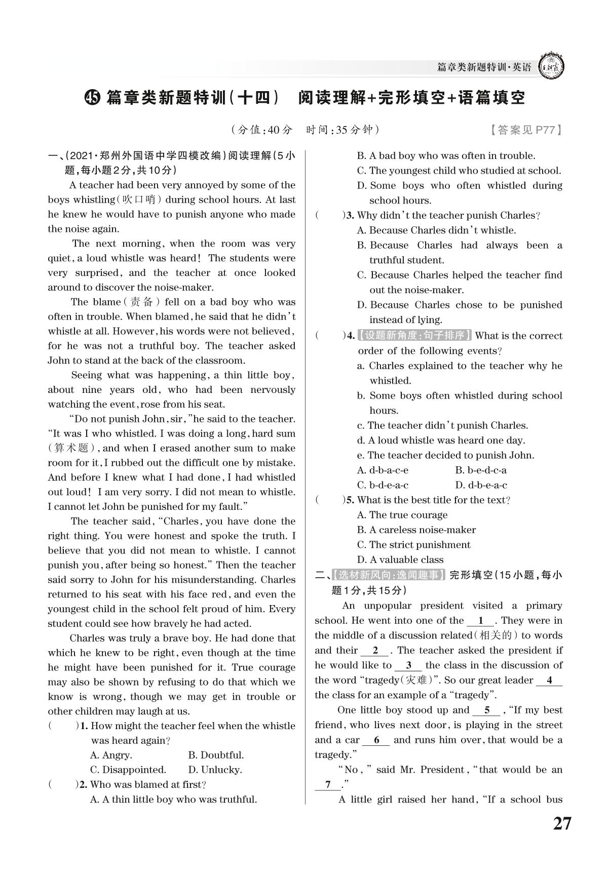 中考英语篇章类新题特训——篇章类新题特训(十四)【阅读理解+完形填空+语篇填空】【45】