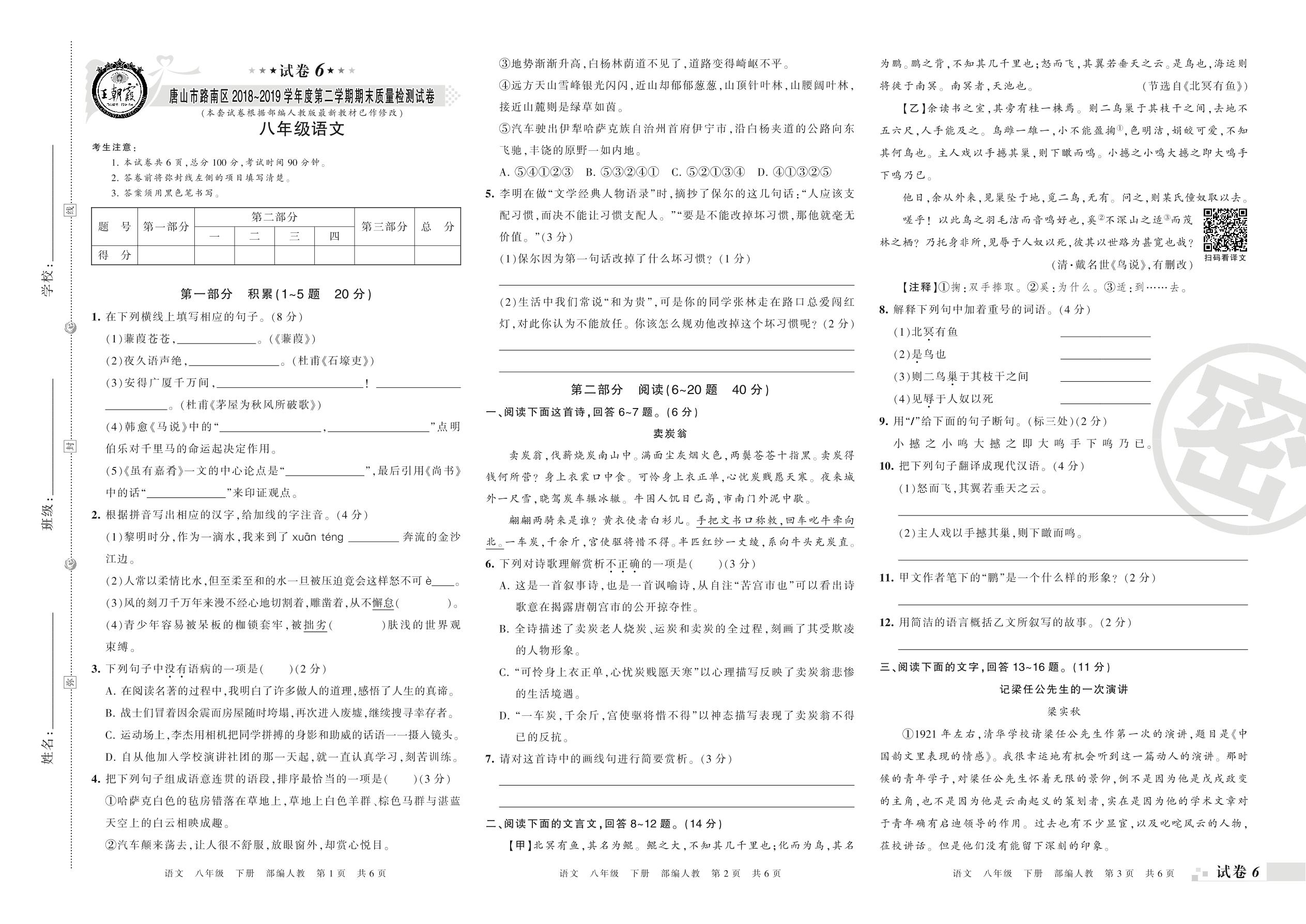 2018-2019学年第二学期唐山市路南区八年级语文试卷(人教版)【6】