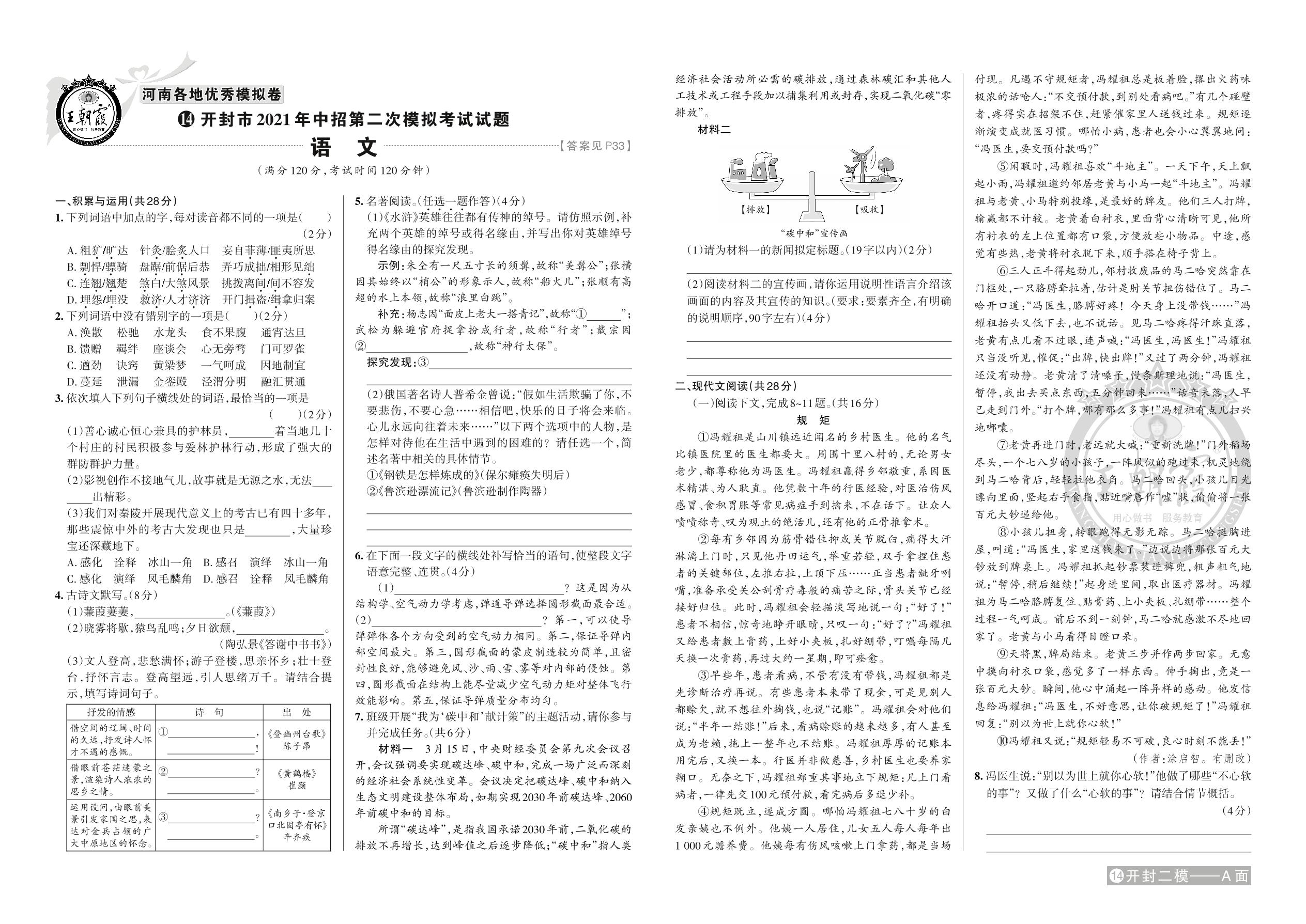 开封市2021年中招第二次模拟考试试题·语文【14】