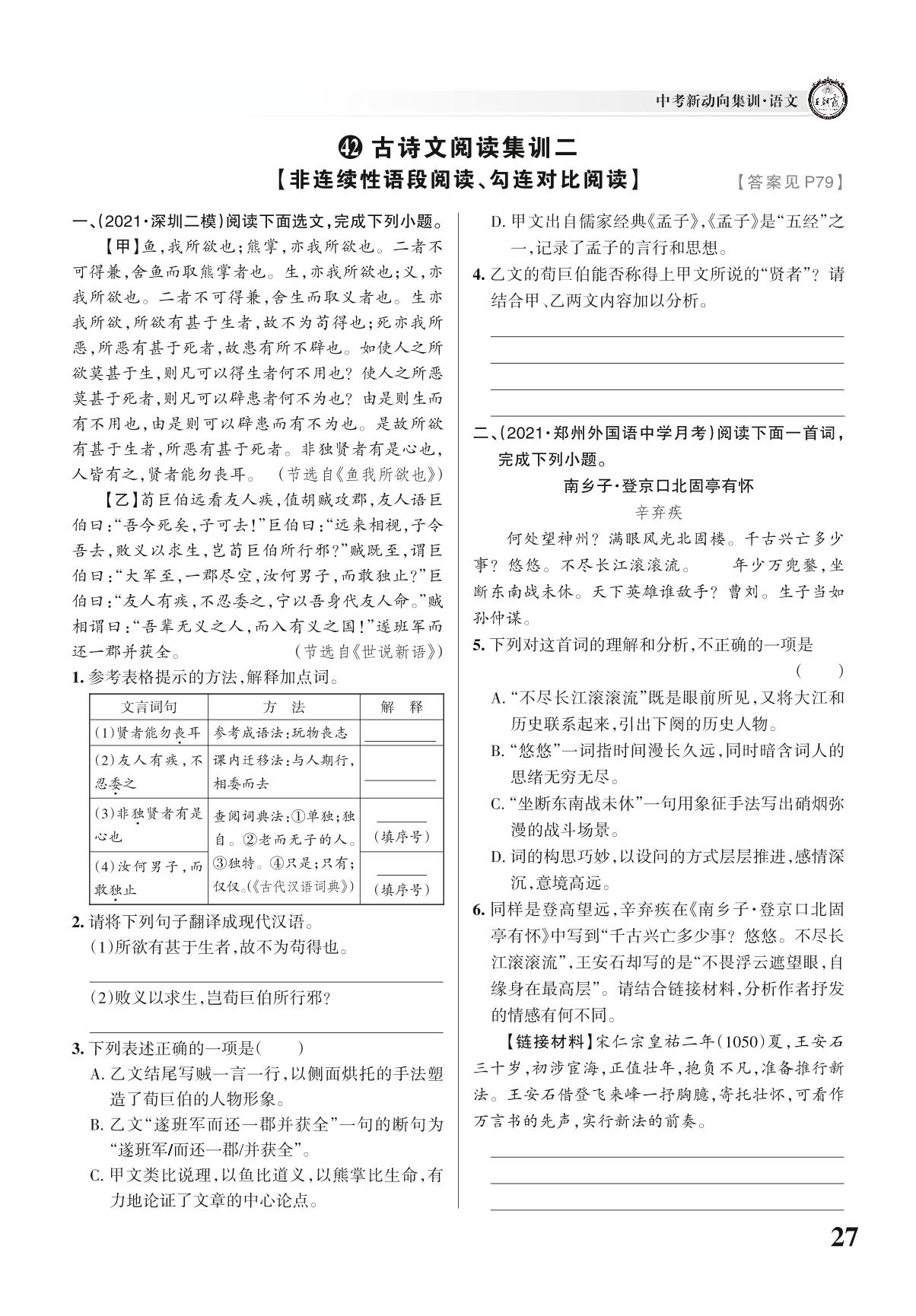 中考语文新动向集训——古诗文阅读集训二【非连续性语段阅读、勾连对比阅读】【42】
