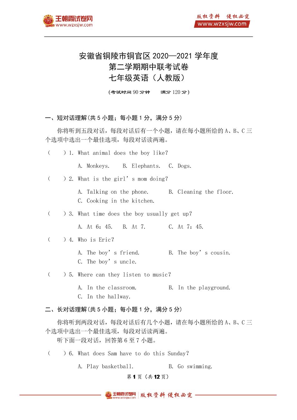安徽省铜陵市铜官区2020~2021学年度第二学期期中联考试卷七年级英语(人教版)