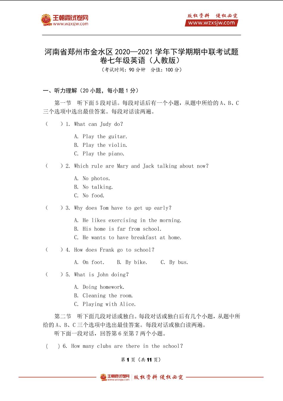 河南省郑州市金水区2020~2021学年下学期期中联考试题卷七年级英语(人教版)