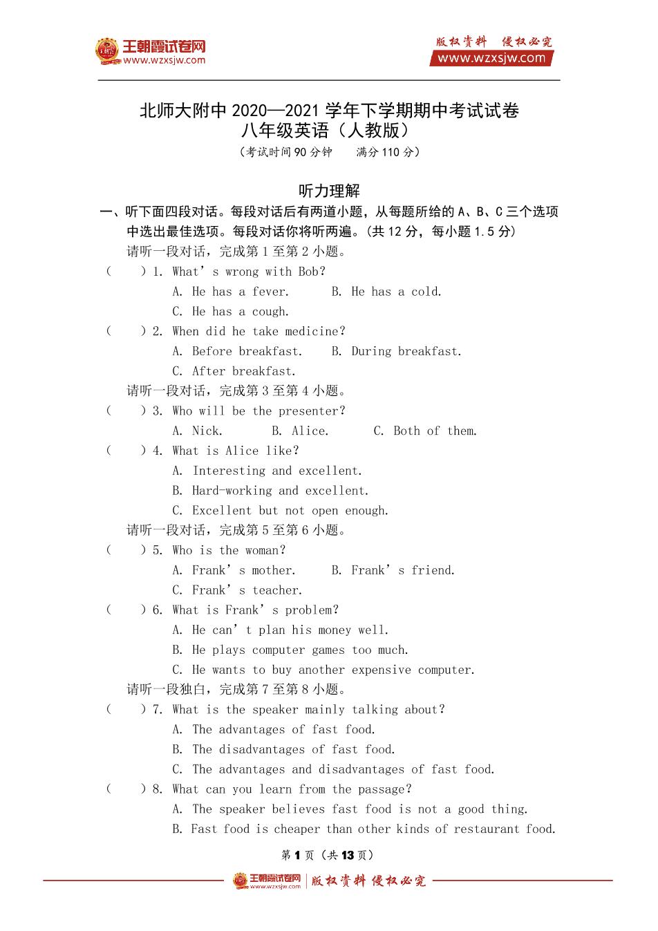 北师大附中2020~2021学年下学期期中考试试卷八年级英语(人教版)【无听力音频】