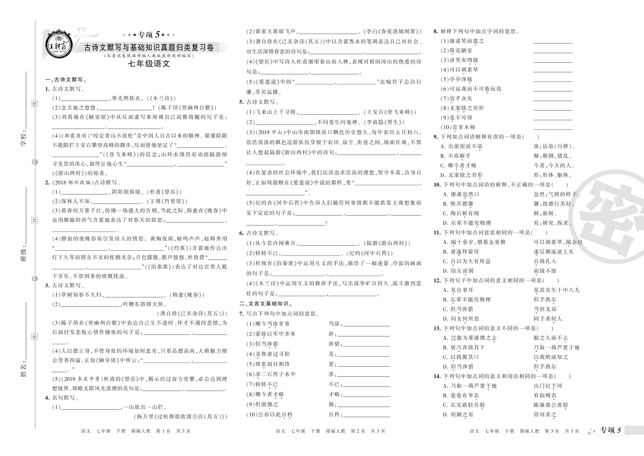 王朝霞期末专项卷——古诗文默写与基础知识、课内文言文阅读真题归类复习卷七年级下册语文(人教版)_R21080224638【0】