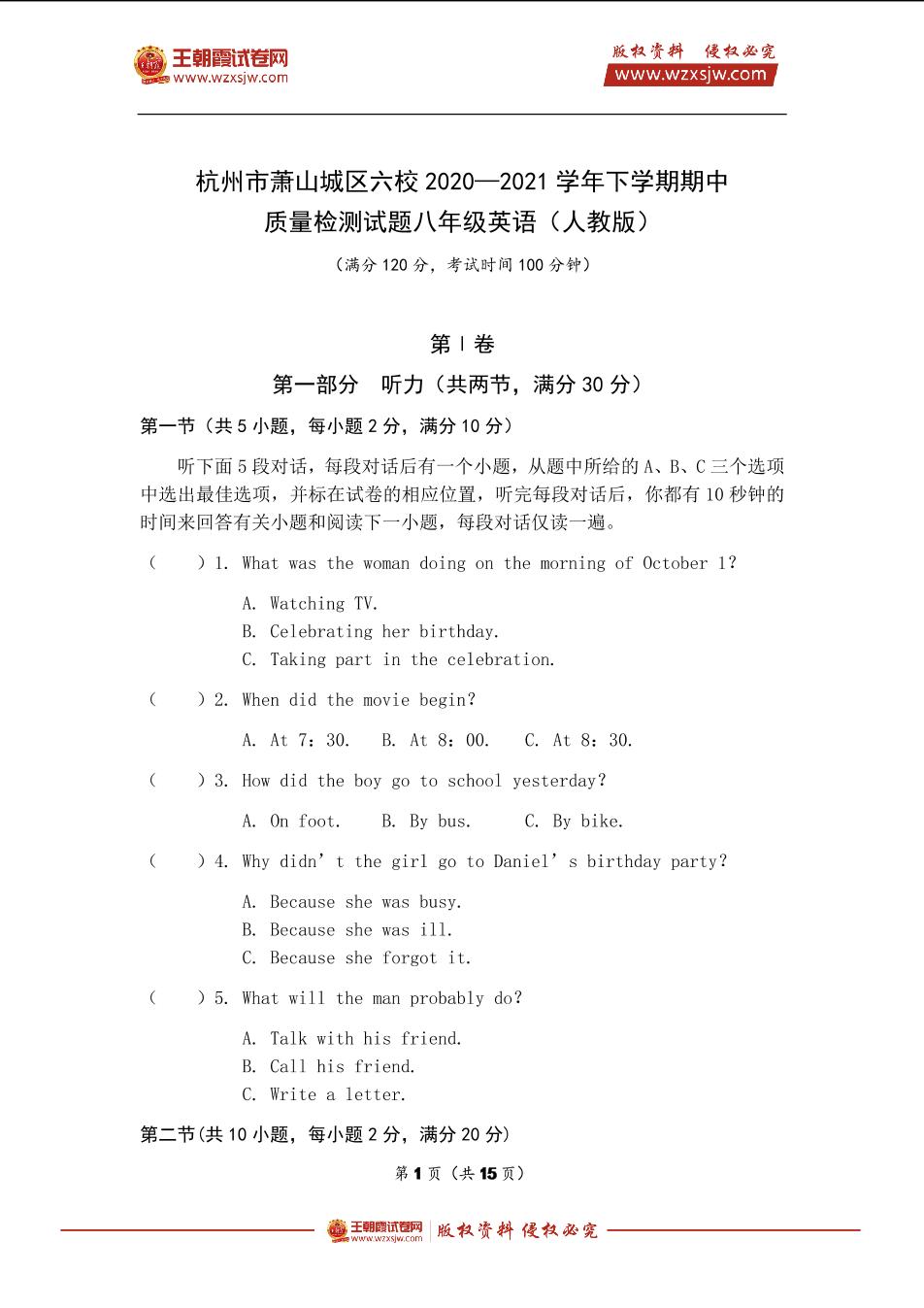 杭州市萧山城区六校2020~2021学年下学期期中质量检测试题八年级英语(人教版)【无听力音频】