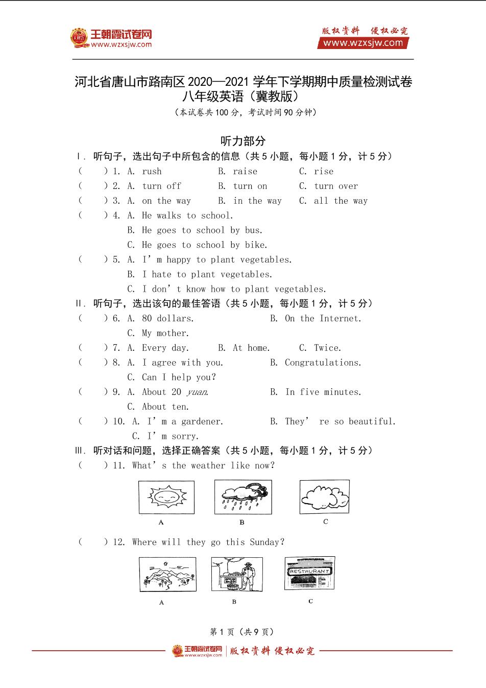 河北省唐山市路南区2020~2021学年下学期期中质量检测试卷八年级英语(冀教版)【无听力音频】