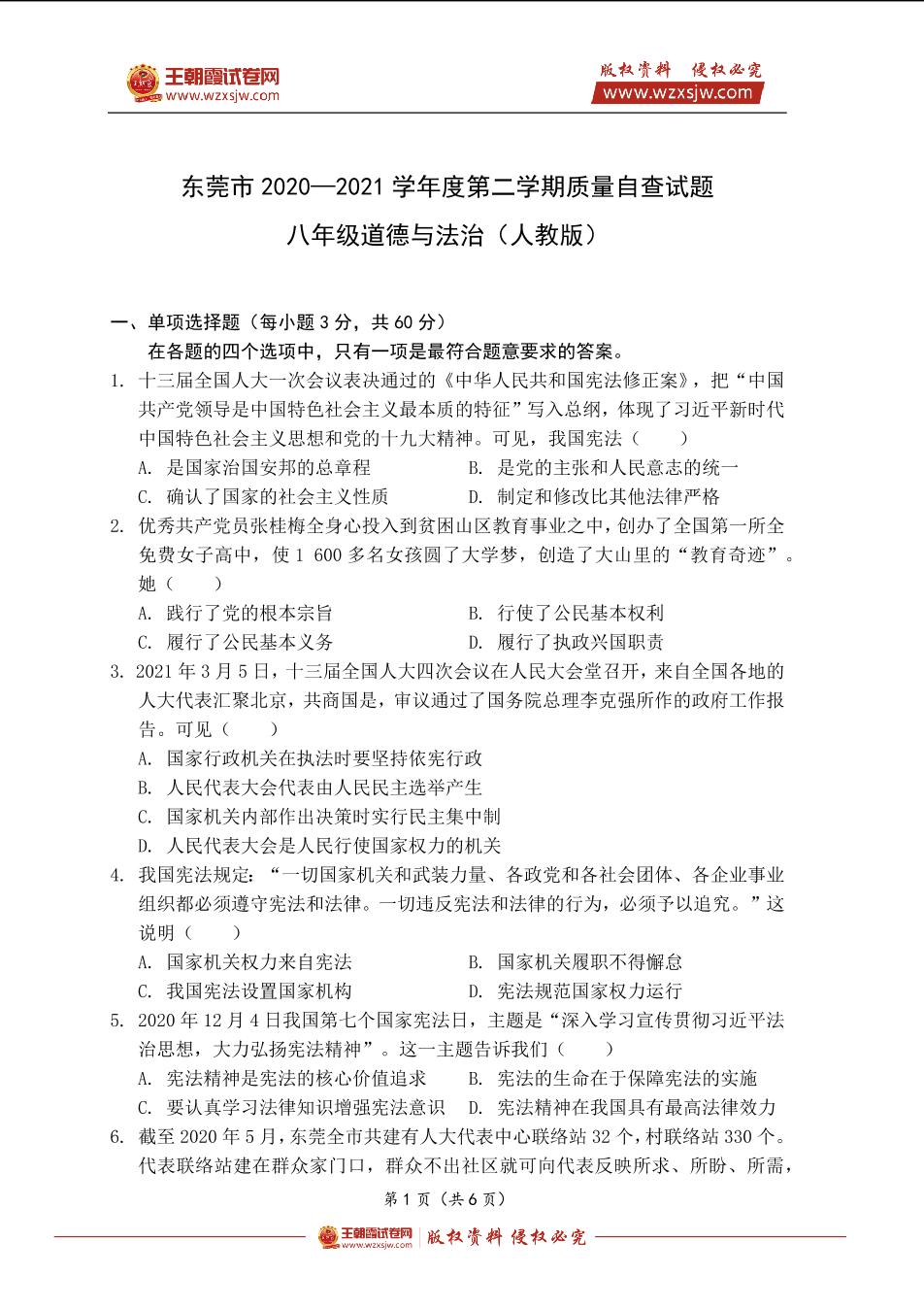 东莞市2020—2021学年度第二学期质量自查试题八年级道德与法治(人教版)