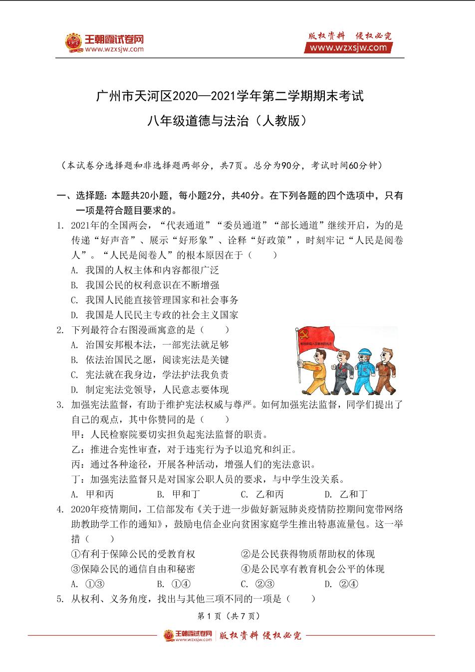 广州市天河区2020—2021学年第二学期期末考试八年级道德与法治(人教版)