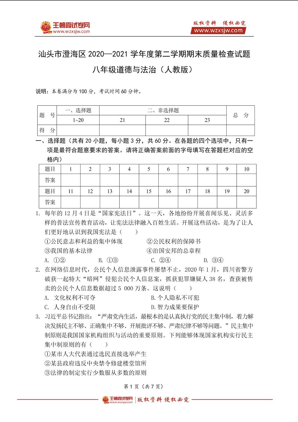 汕头市澄海区2020—2021学年度第二学期期末质量检查试题八年级道德与法治(人教版)