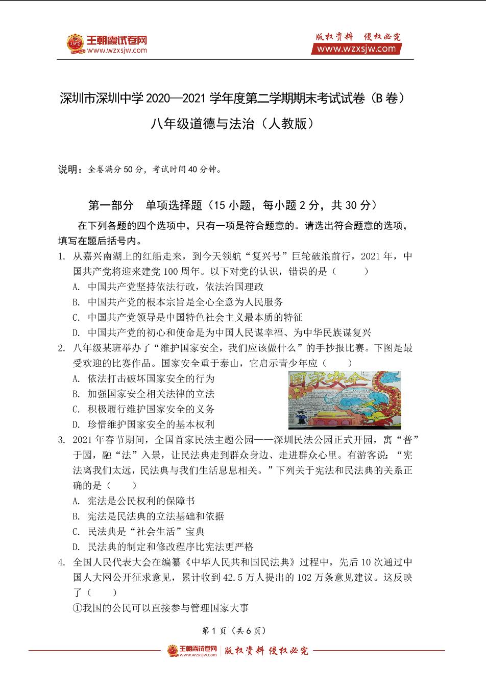 深圳市深圳中学2020—2021学年度第二学期期末考试试卷(B卷)八年级道德与法治(人教版)