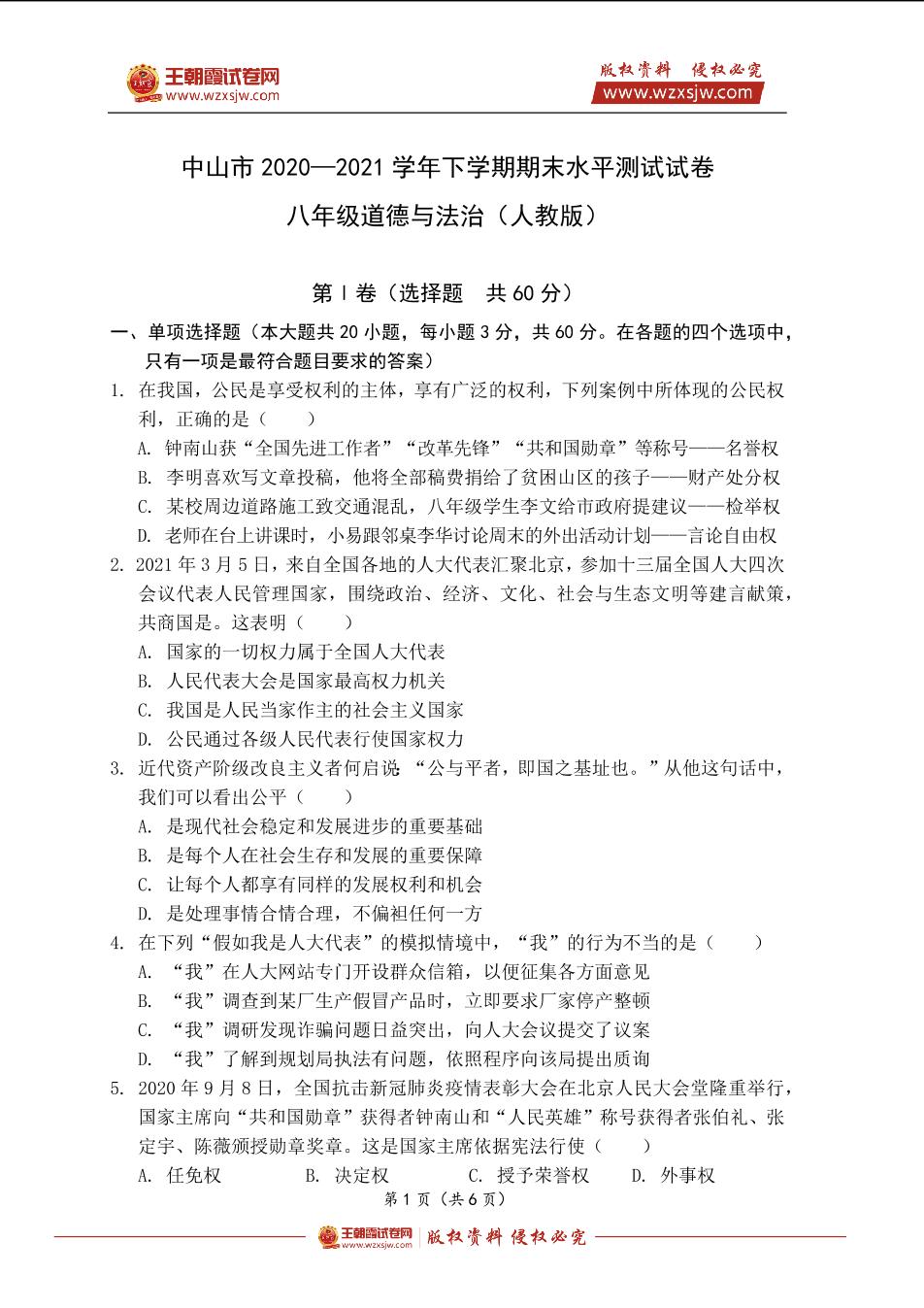 中山市2020—2021学年下学期期末水平测试试卷八年级道德与法治(人教版)