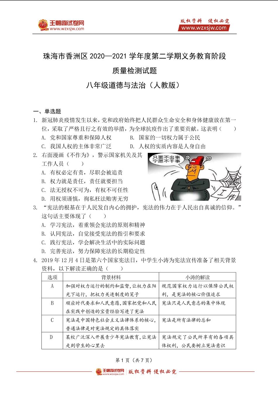珠海市香洲区2020—2021学年度第二学期义务教育阶段质量检测试题八年级道德与法治(人教版)