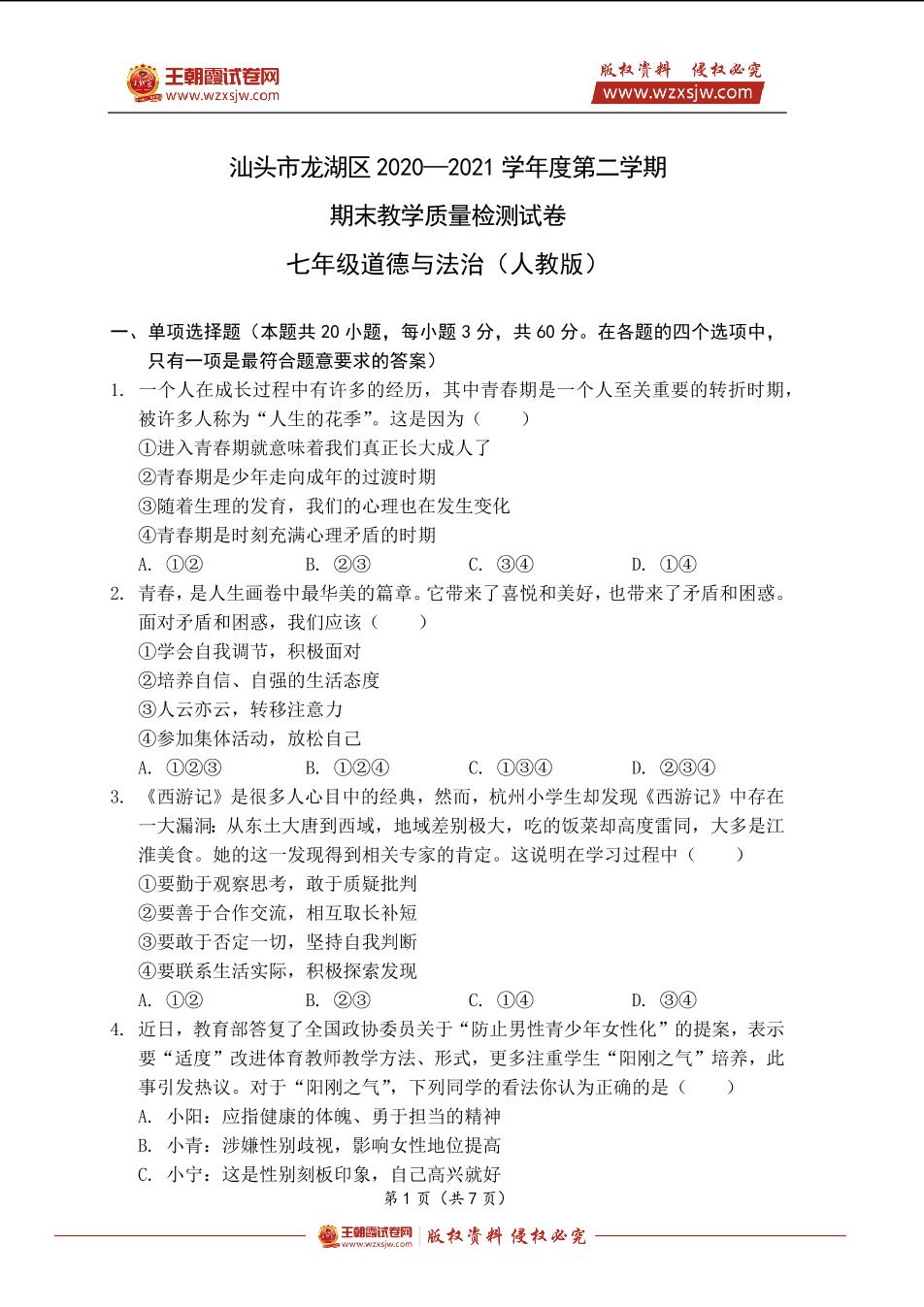 汕头市龙湖区2020—2021学年度第二学期期末教学质量检测试卷七年级道德与法治(人教版)