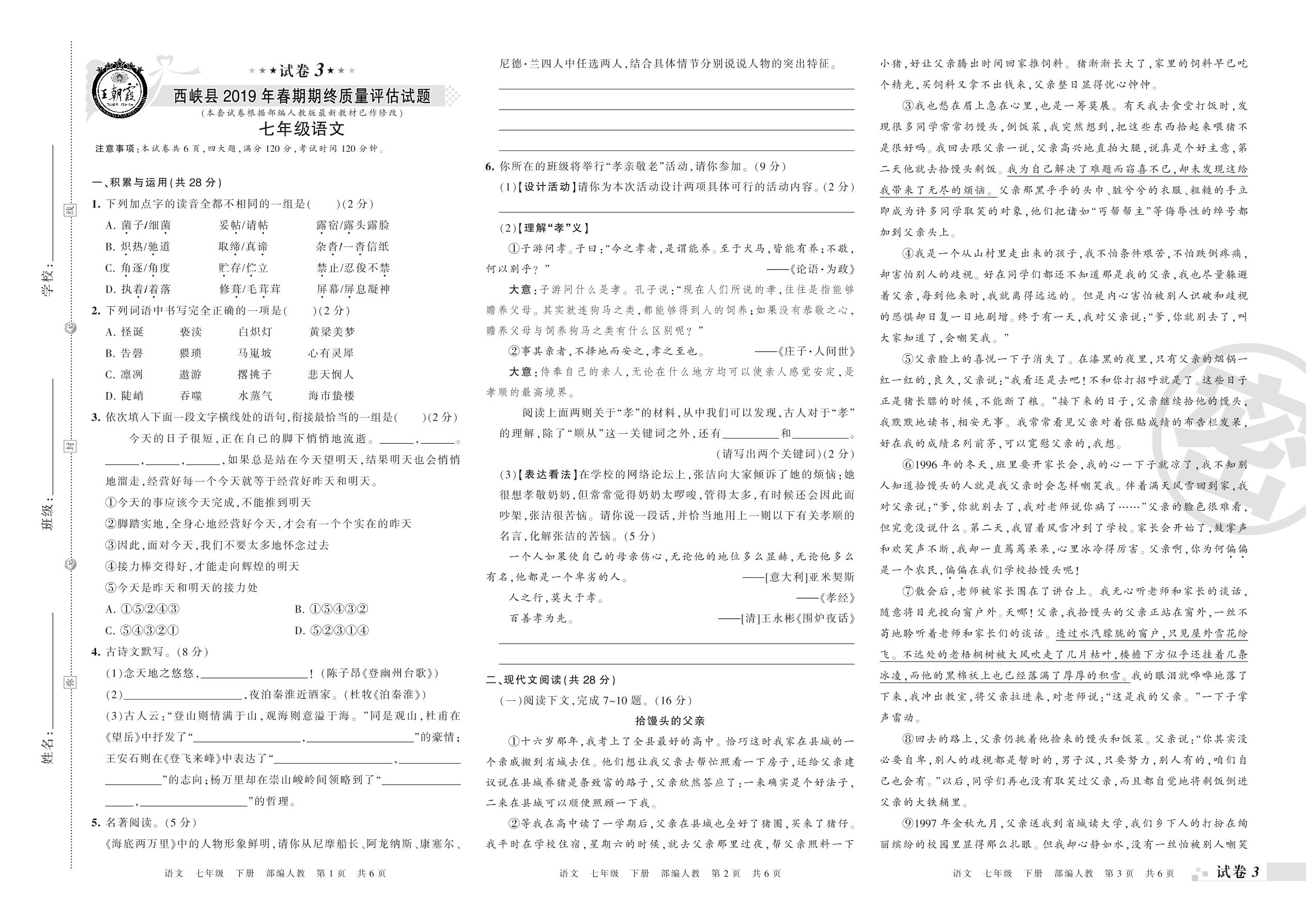 2018-2019学年第二学期南阳市西峡县七年级语文试卷(人教版)【3】