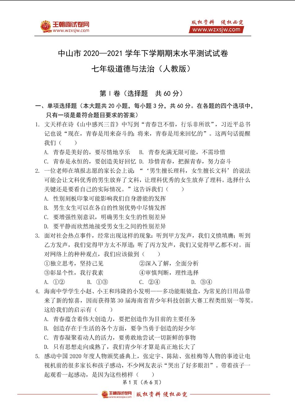 中山市2020—2021学年下学期期末水平测试试卷七年级道德与法治(人教版)