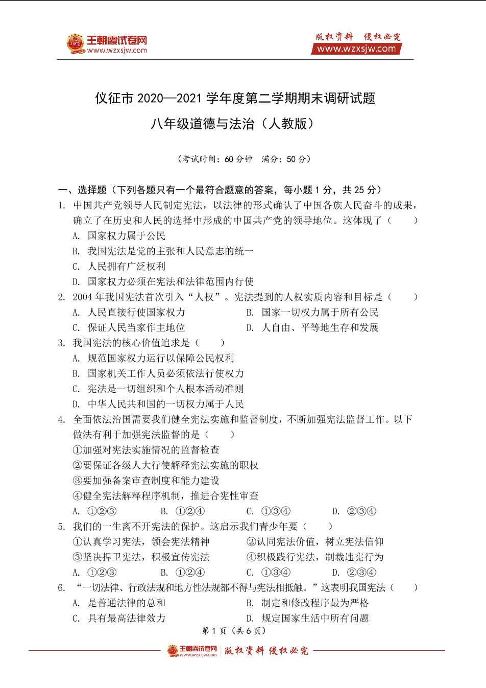 仪征市2020—2021学年度第二学期期末调研试题八年级道德与法治(人教版)