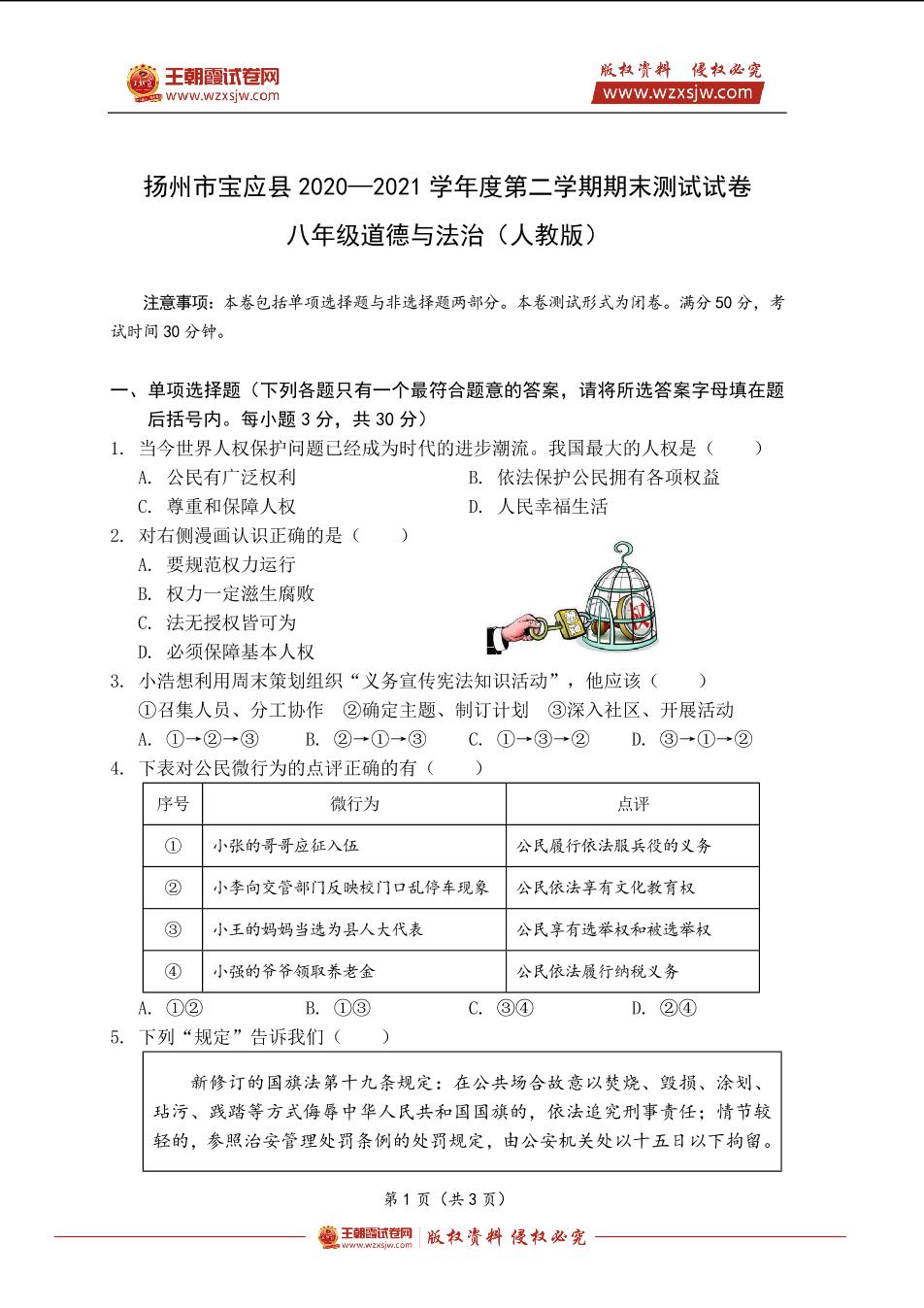 扬州市宝应县2020—2021学年度第二学期期末测试试卷八年级道德与法治(人教版)