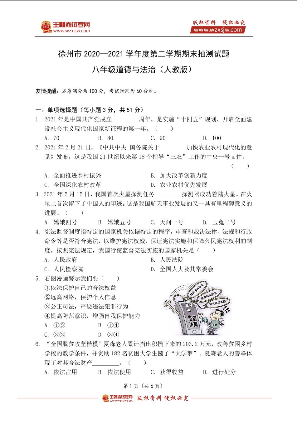 徐州市2020—2021学年度第二学期期末抽测试题八年级道德与法治(人教版)