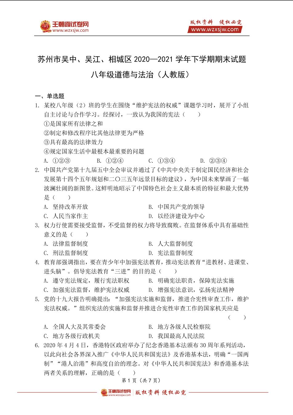 苏州市吴中、吴江、相城区2020—2021学年下学期期末试题八年级道德与法治(人教版)