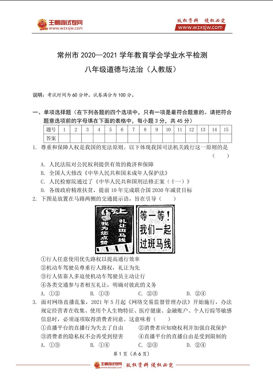 常州市2020—2021学年教育学会学业水平检测八年级道德与法治(人教版)