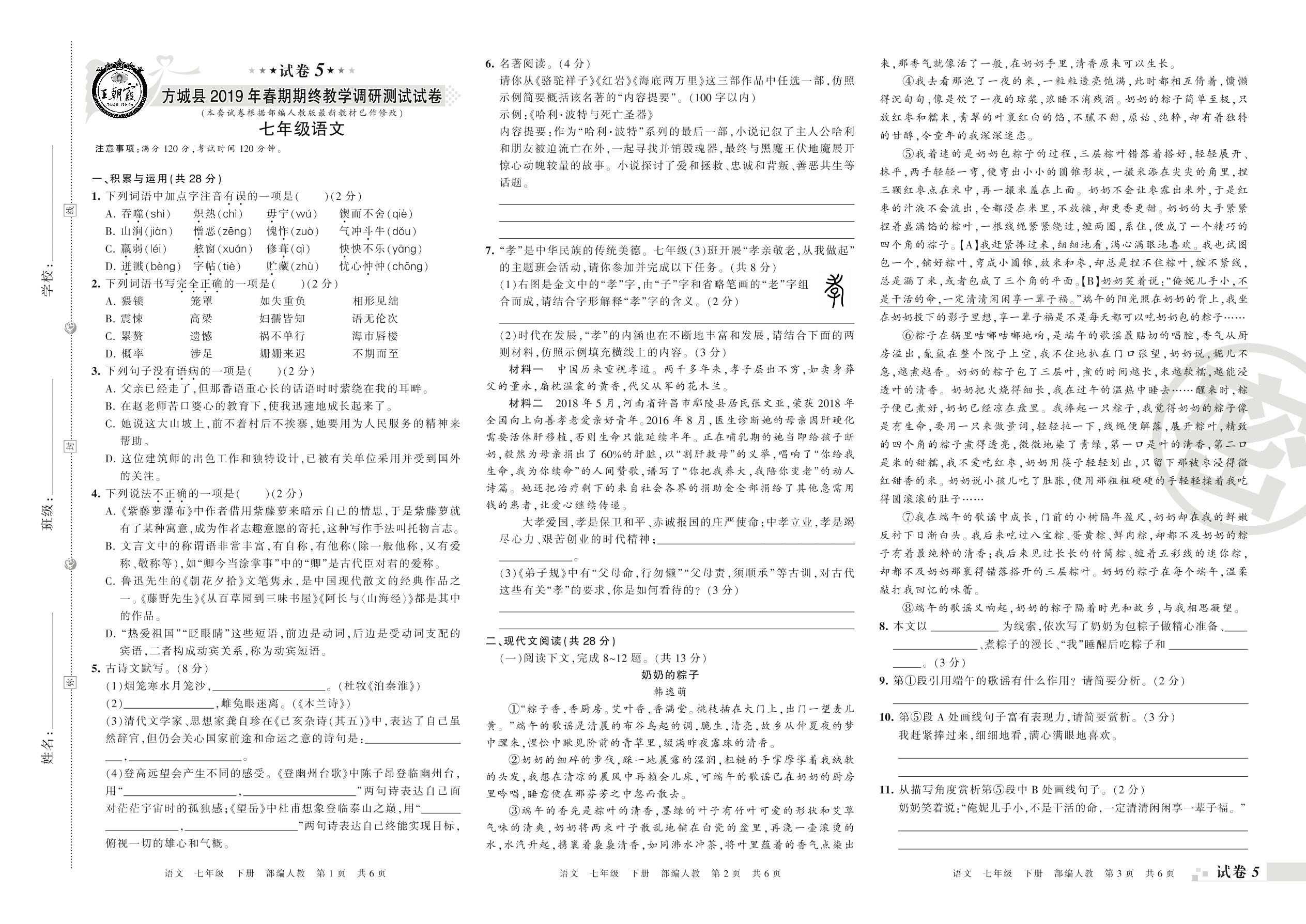 2018-2019学年第二学期南阳市方城县七年级语文试卷(人教版)【5】