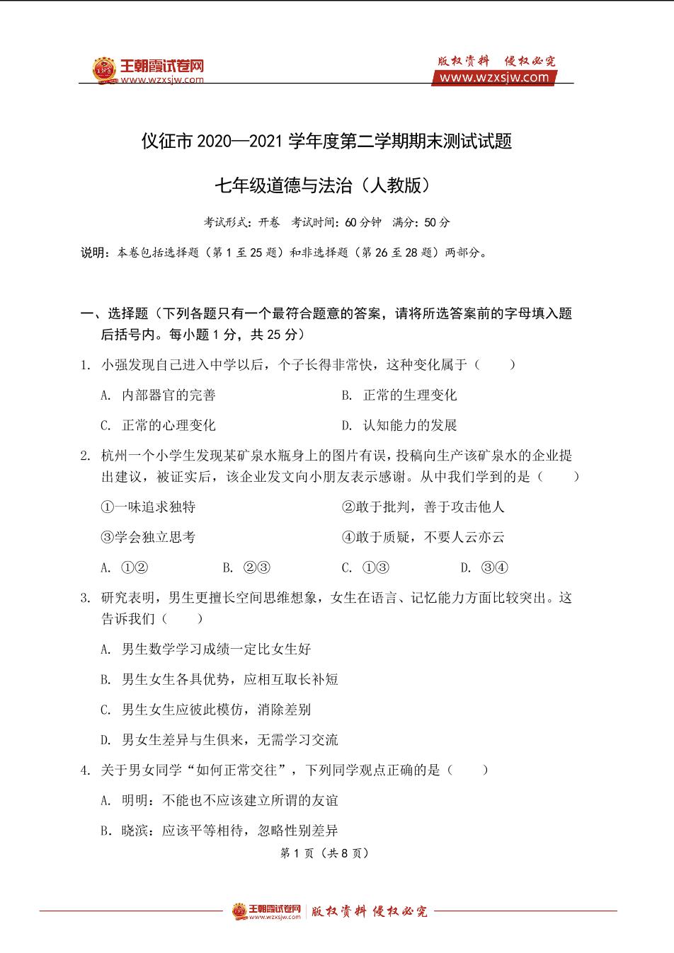 仪征市2020—2021学年七年级下学期期末测试道德与法治试题(人教版)