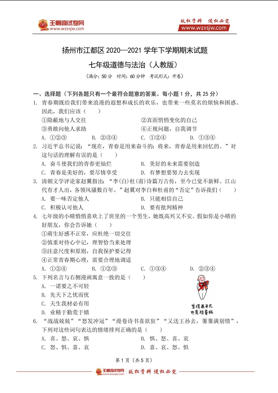 扬州市江都区2020—2021学年七年级下学期期末道德与法治试题(人教版)