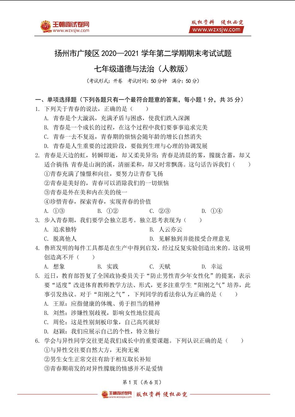 扬州市广陵区2020—2021学年七年级下学期期末道德与法治试题(人教版)