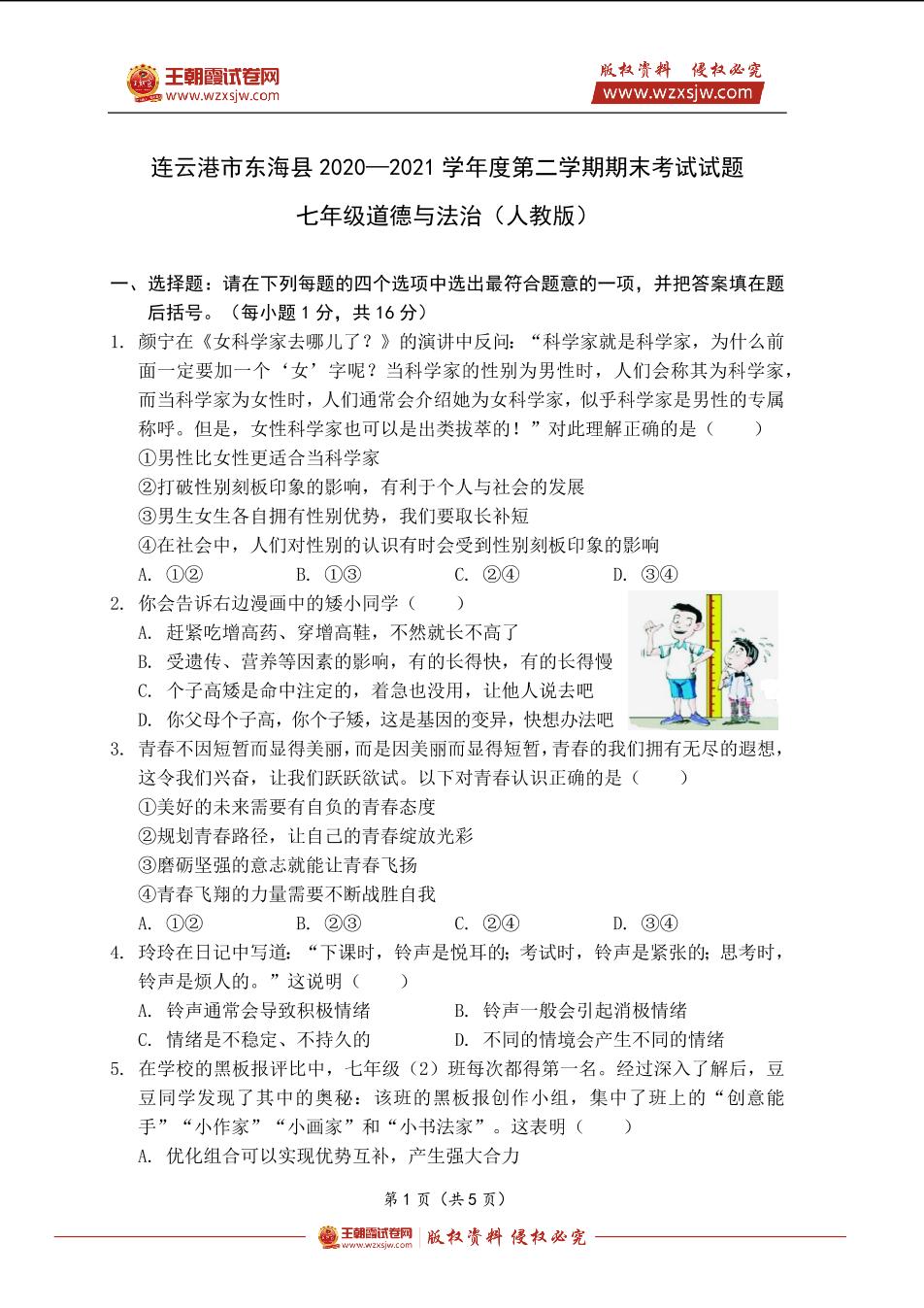 连云港市东海县2020—2021学年度第二学期期末考试试题七年级道德与法治(人教版)
