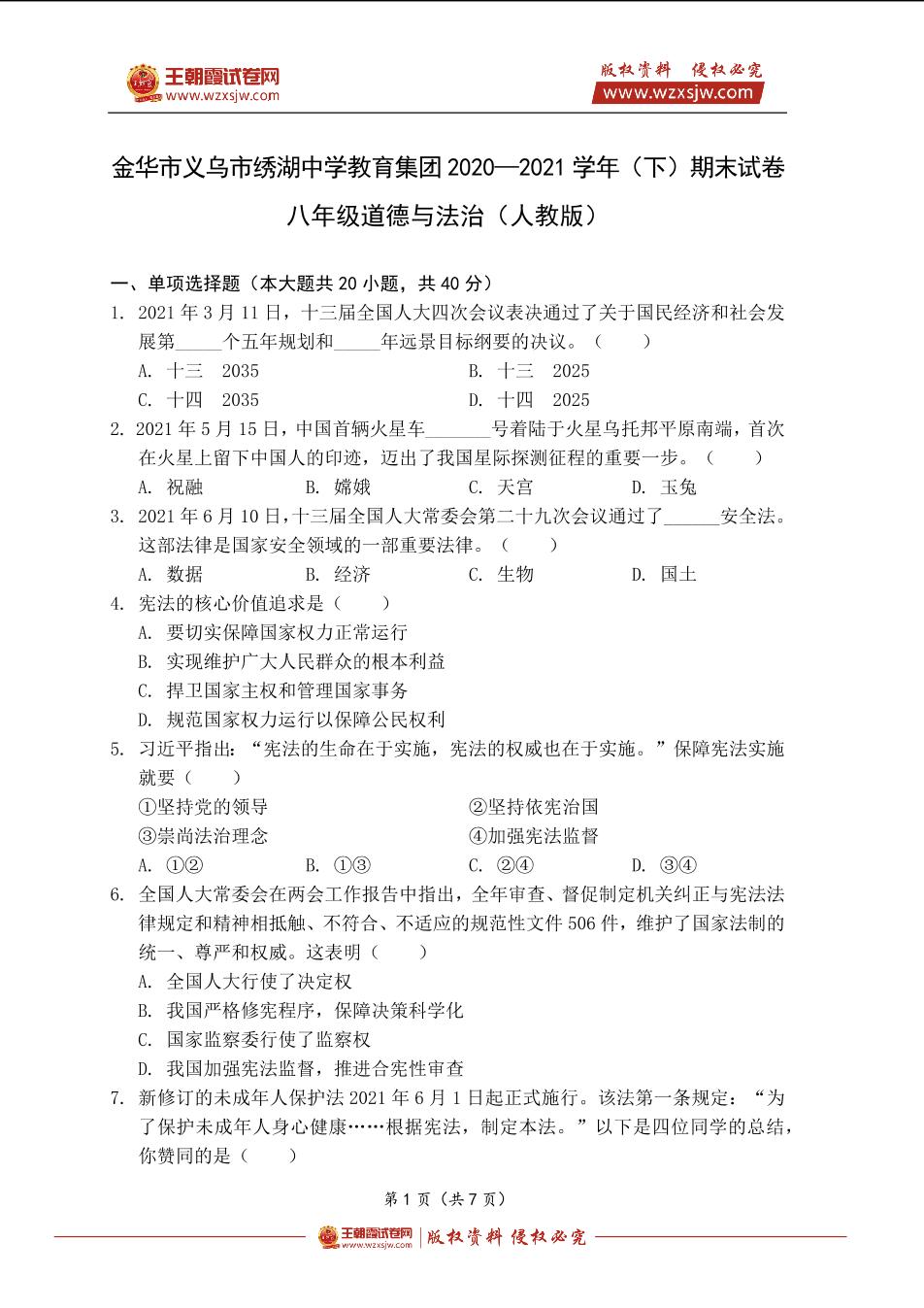 金华市义乌市绣湖中学教育集团2020—2021学年(下)期末试卷八年级道德与法治(人教版)