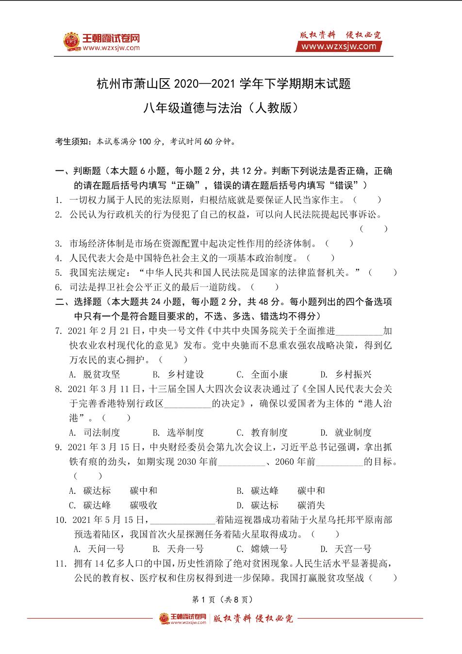 杭州市萧山区2020—2021学年下学期期末试题八年级道德与法治(人教版)