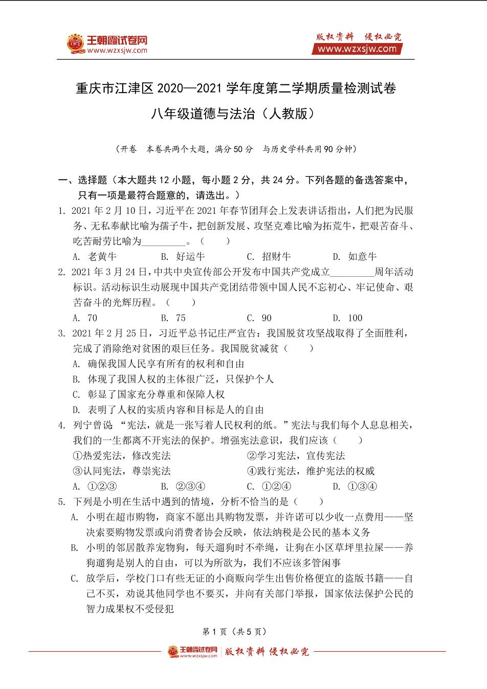 重庆市江津区2020—2021学年度第二学期质量检测试卷八年级道德与法治(人教版)