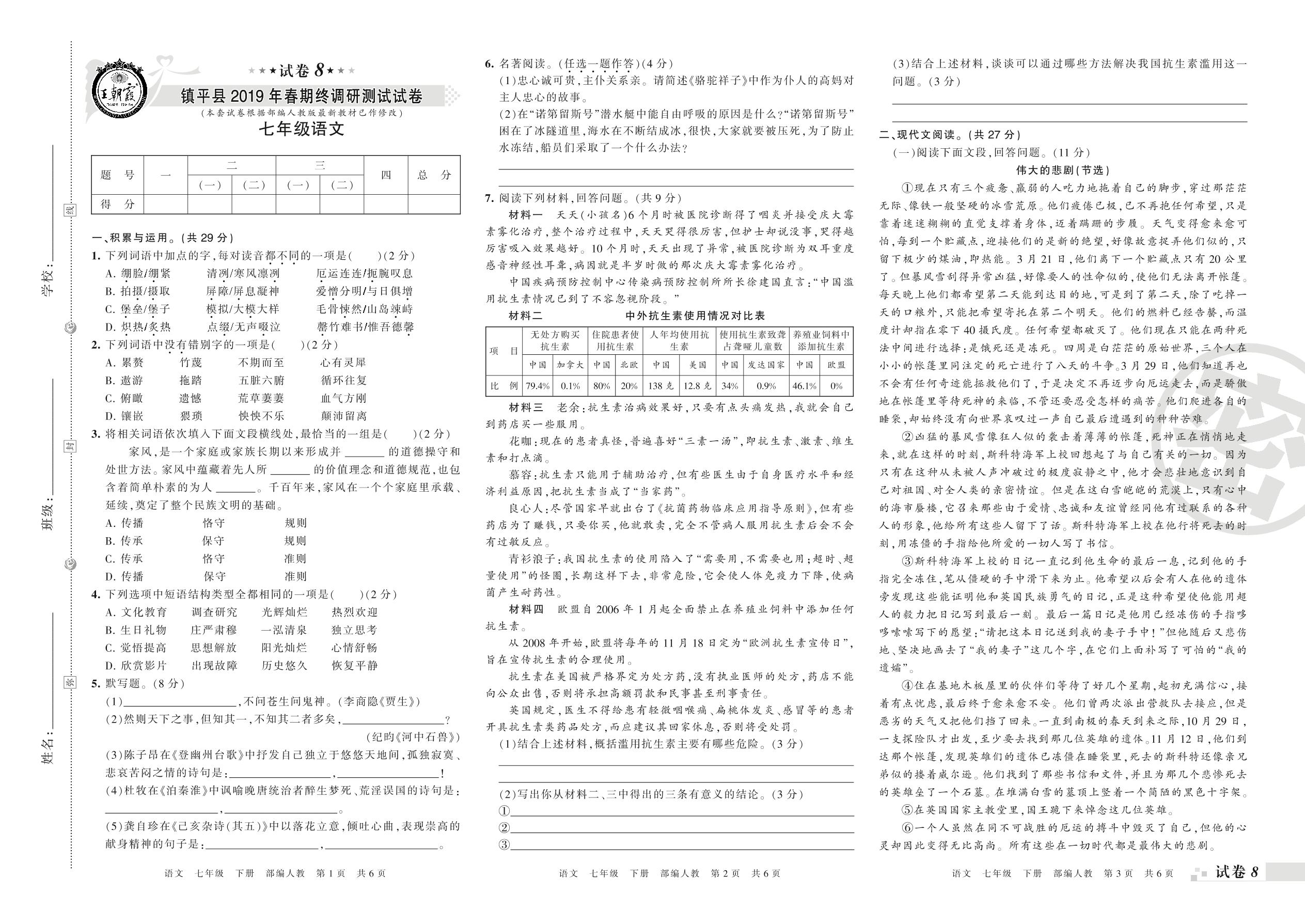 2018-2019学年第二学期南阳市镇平县七年级语文试卷(人教版)【8】