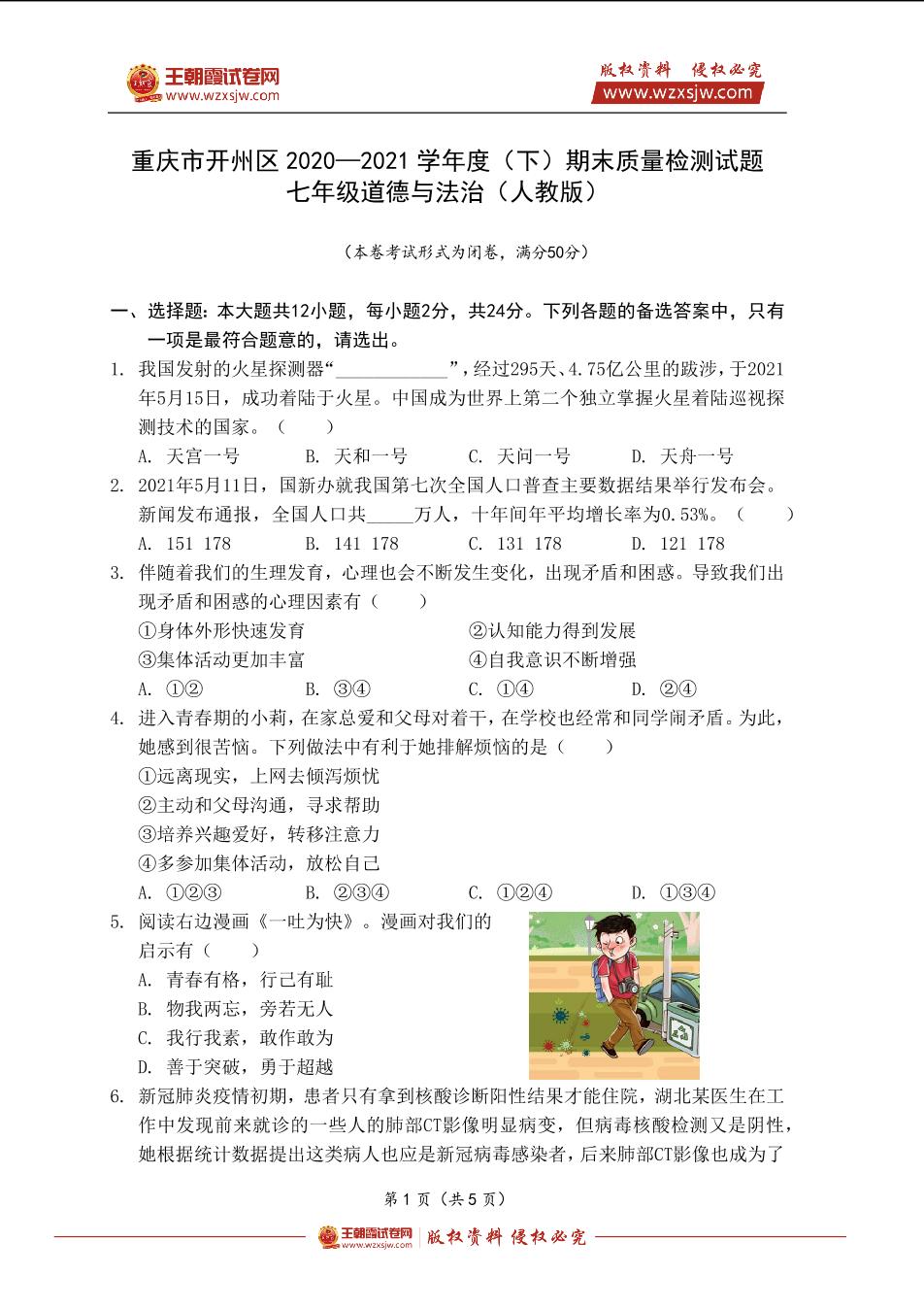 重庆市开州区2020—2021学年度(下)期末质量检测试题七年级道德与法治(人教版)