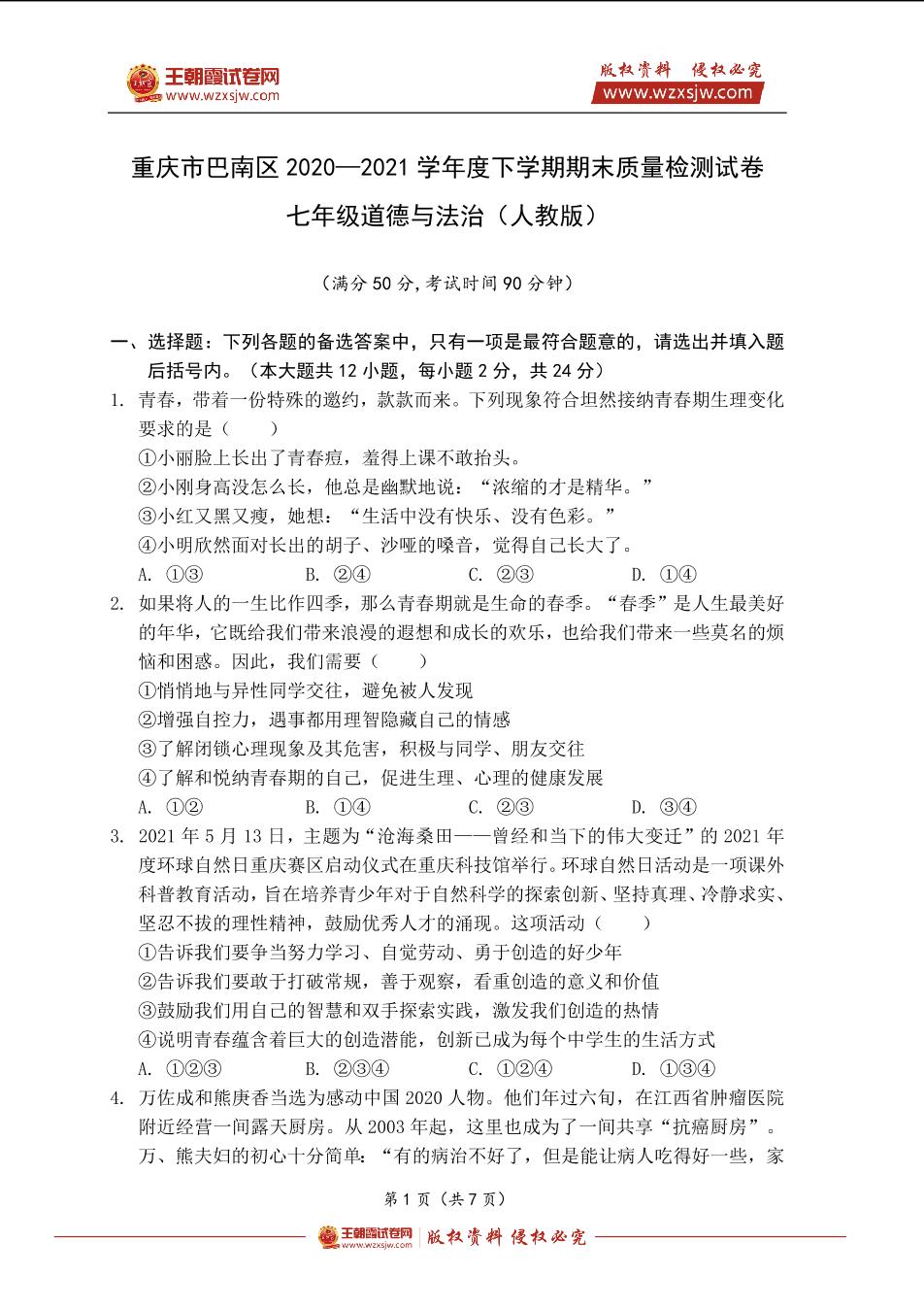 重庆巴南区2020—2021学年度下学期期末质量检测试卷七年级道德与法治(人教版)