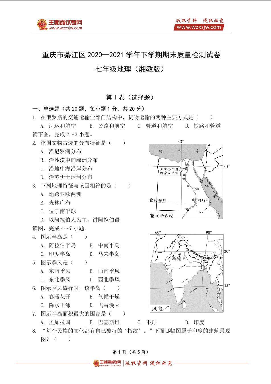 重庆市綦江区2020—2021学年下学期期末质量检测试卷七年级地理(湘教版)