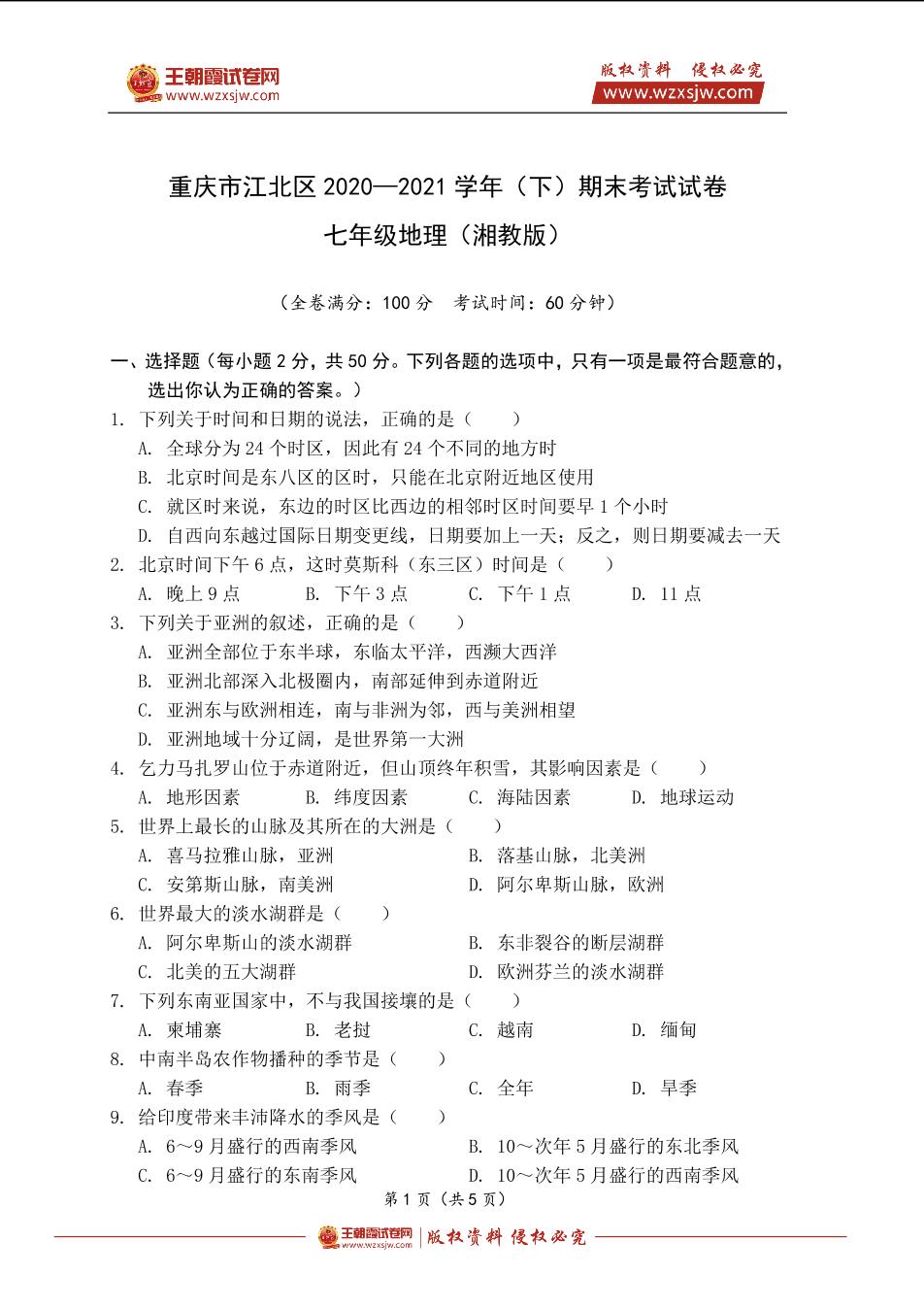 重庆市江北区2020—2021学年(下)期末考试试卷七年级地理(湘教版)
