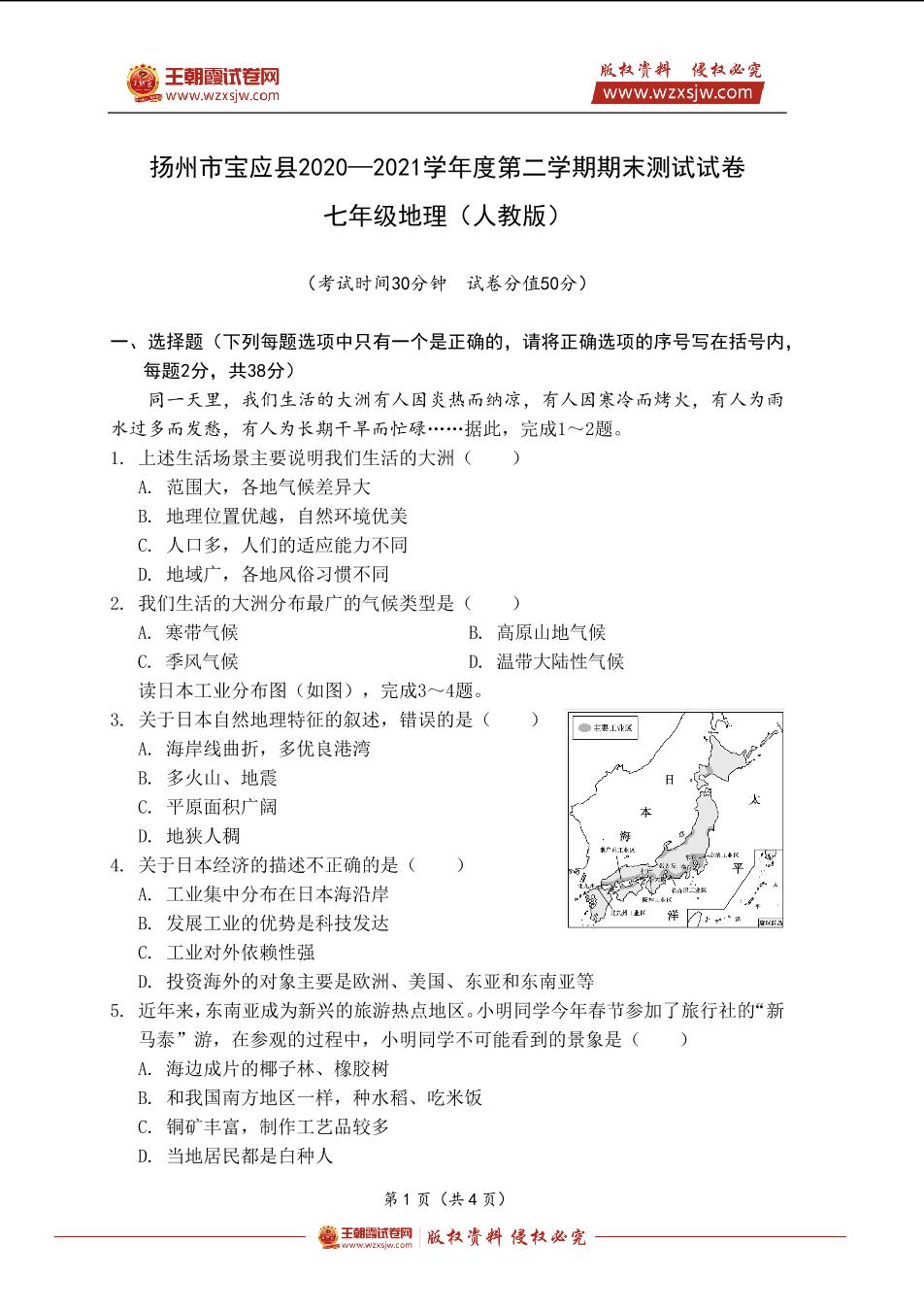 扬州市宝应县2020—2021学年度第二学期期末测试试卷七年级地理(人教版)