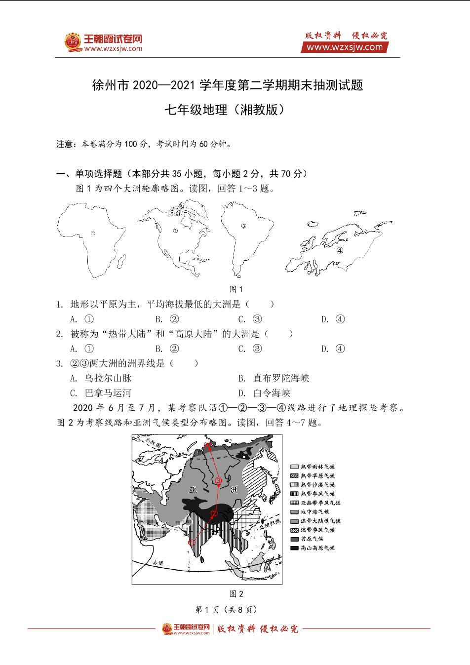 徐州市2020—2021学年度第二学期期末抽测试题七年级地理(湘教版)
